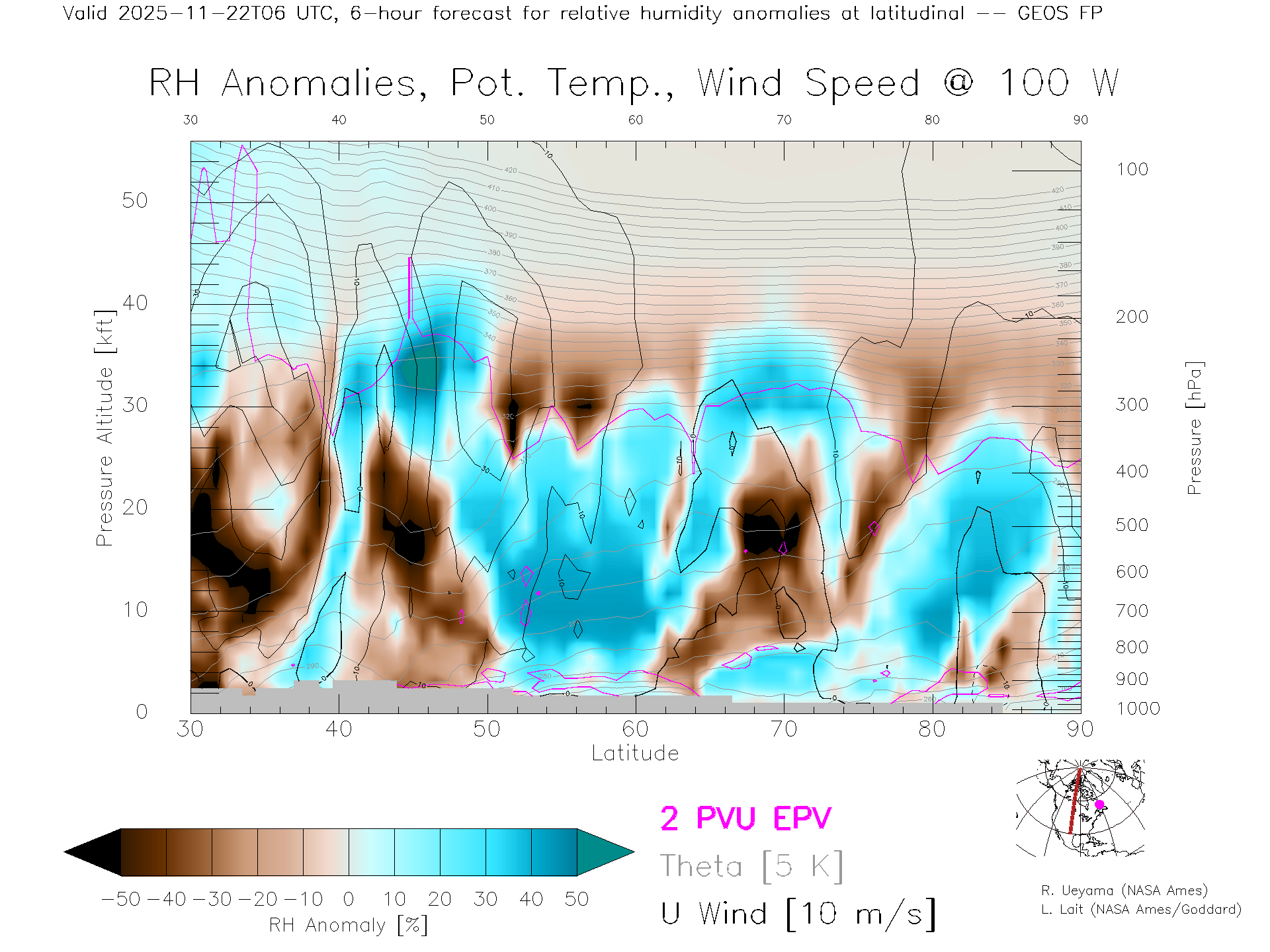 GEOS Forecast Rel. Hum. X-Section (100 W)