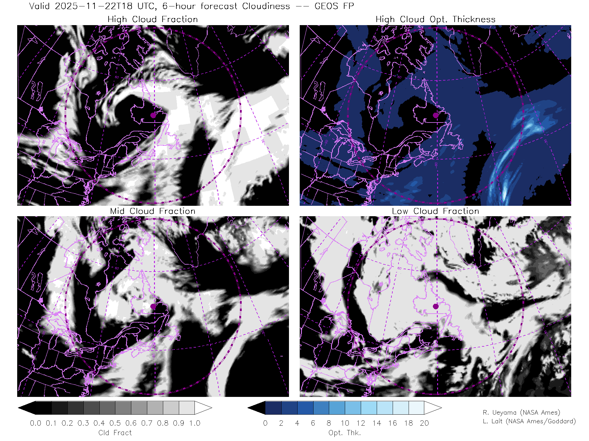 GEOS Forecast Cloud Fraction (High, Mid, Low) & High Cloud Optical Thickness