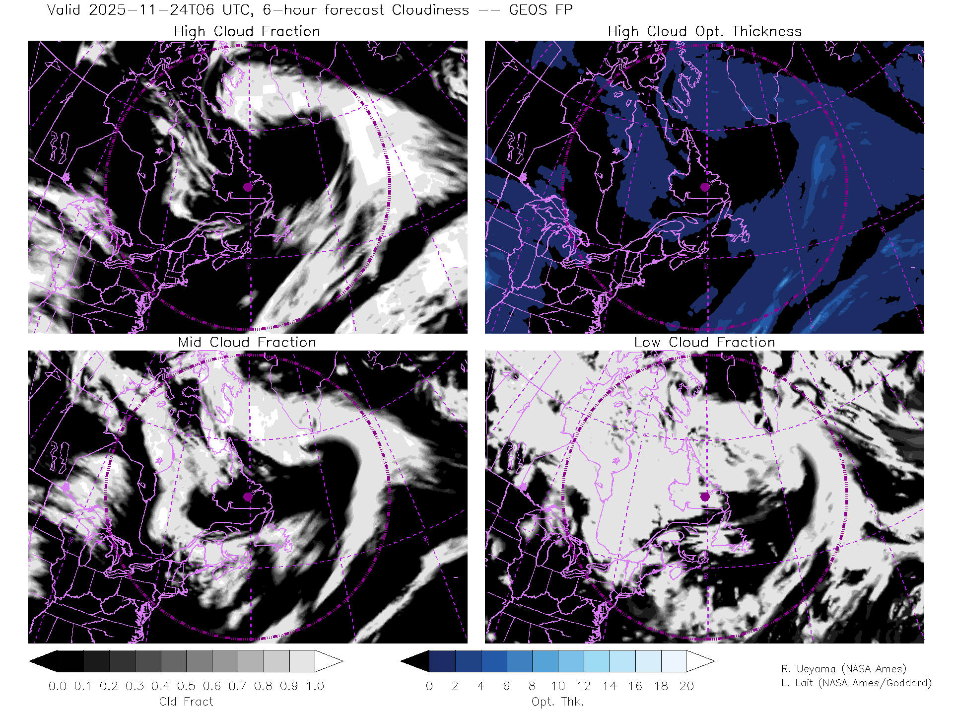 GEOS Forecast Cloud Fraction (High, Mid, Low) & High Cloud Optical Thickness