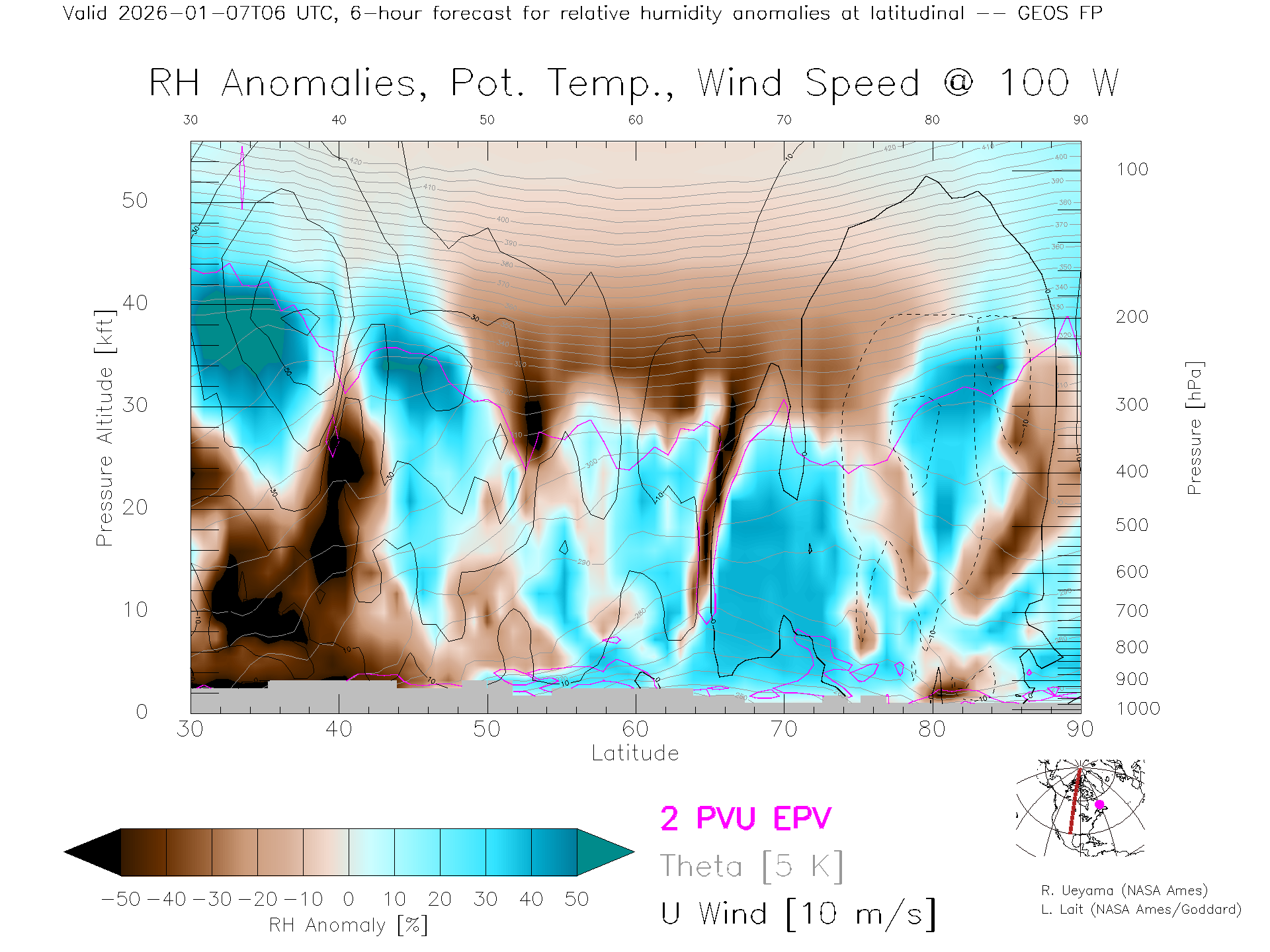 GEOS Forecast Rel. Hum. X-Section (100 W)