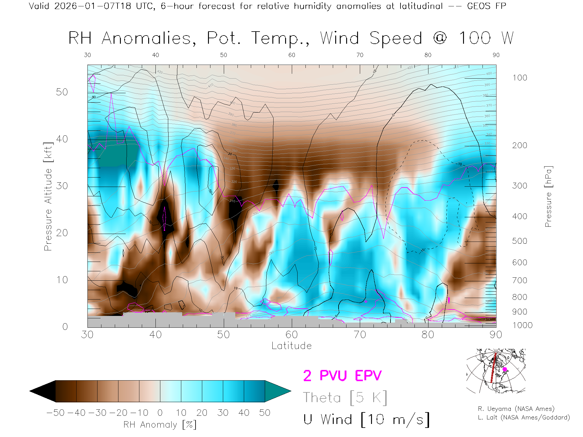GEOS Forecast Rel. Hum. X-Section (100 W)