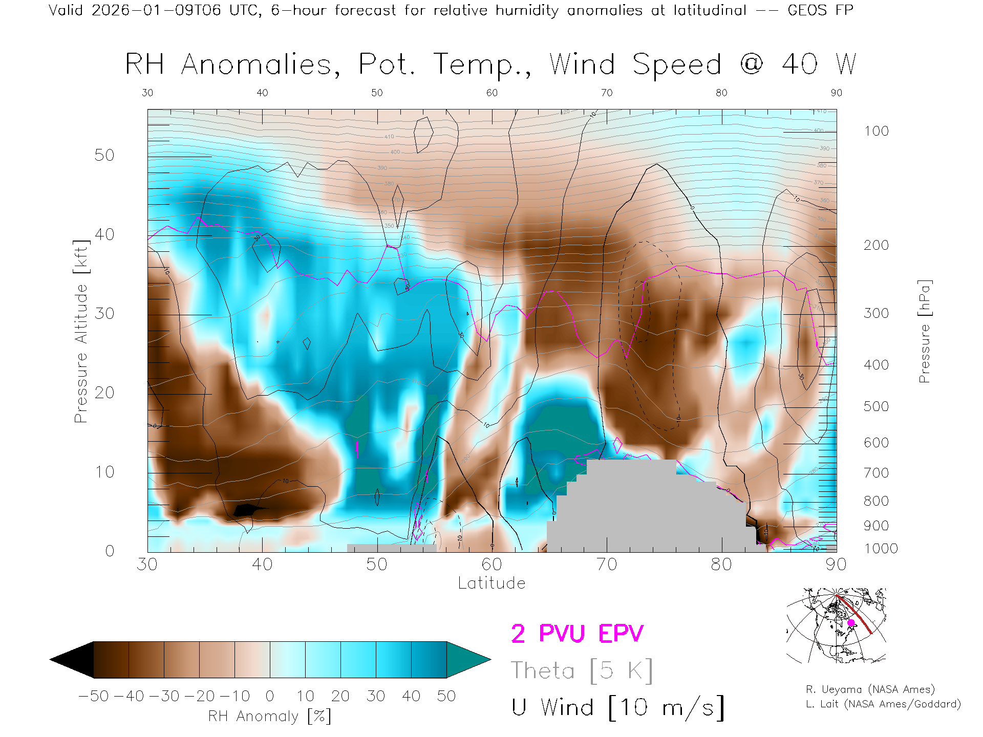 GEOS Forecast Rel. Hum. X-Section (40 W)