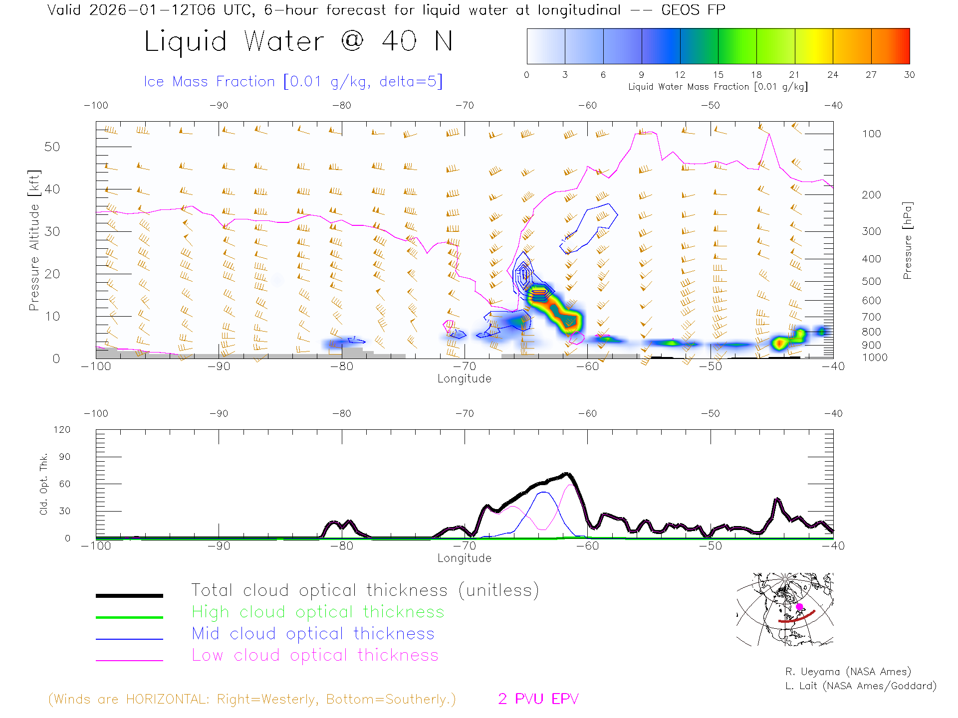 GEOS Forecast Cloud Water Content X-Section (40 N)
