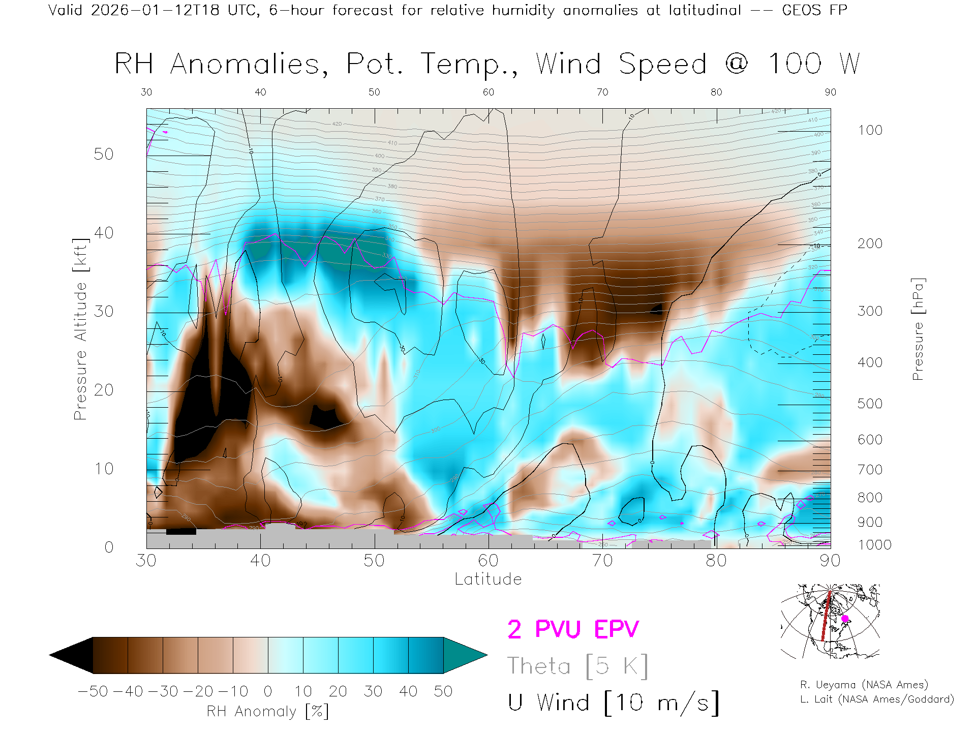 GEOS Forecast Rel. Hum. X-Section (100 W)