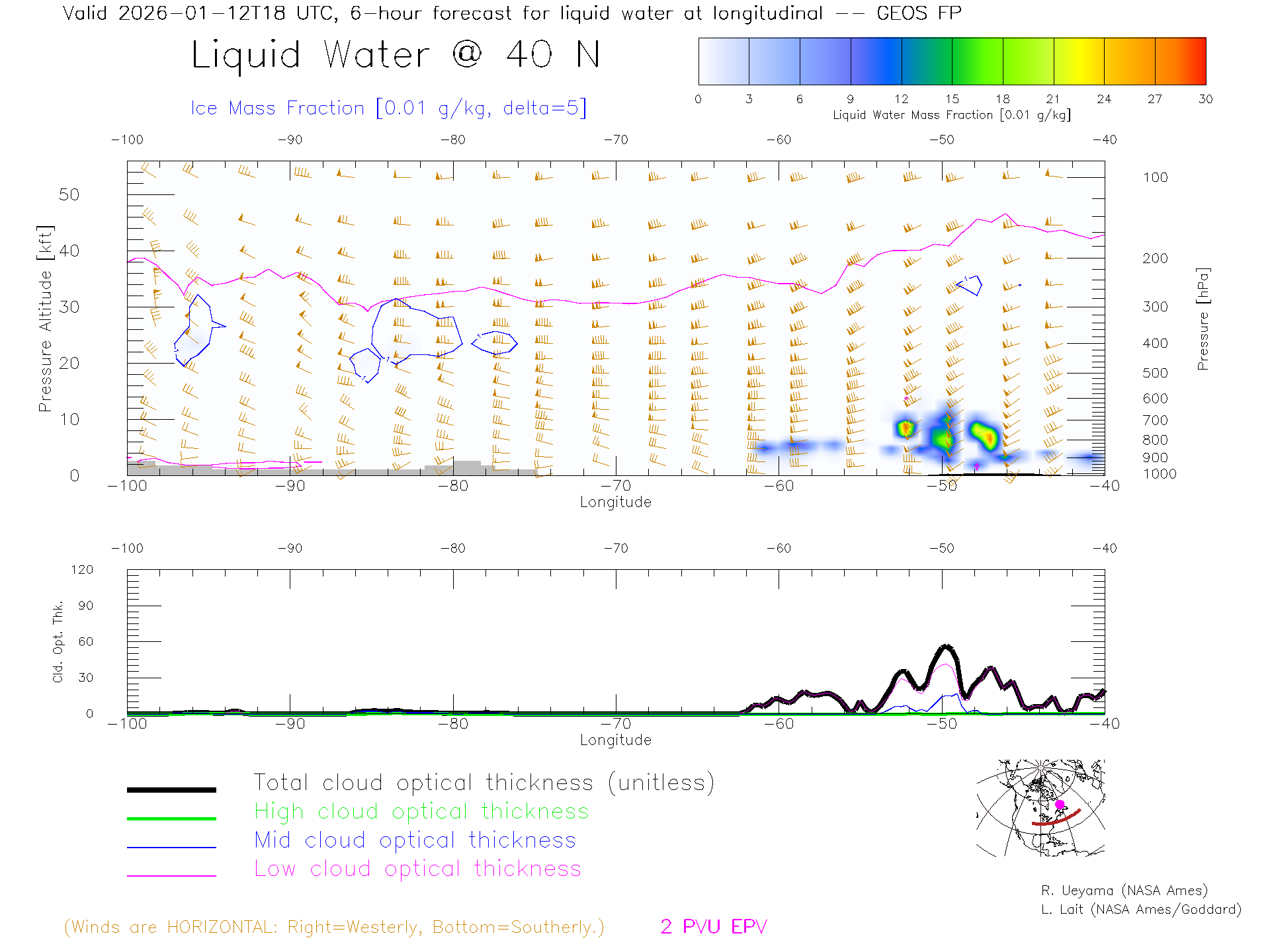 GEOS Forecast Cloud Water Content X-Section (40 N)