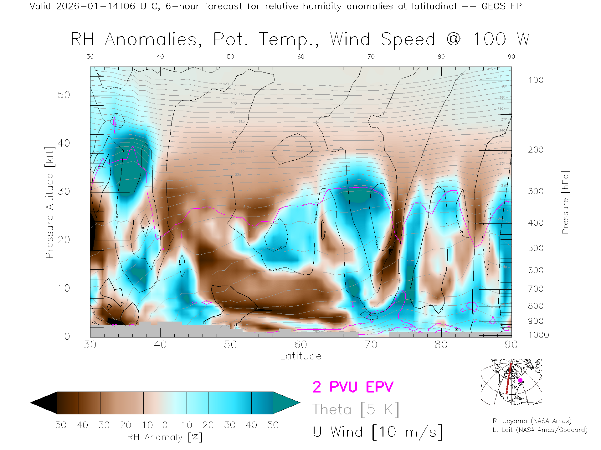 GEOS Forecast Rel. Hum. X-Section (100 W)