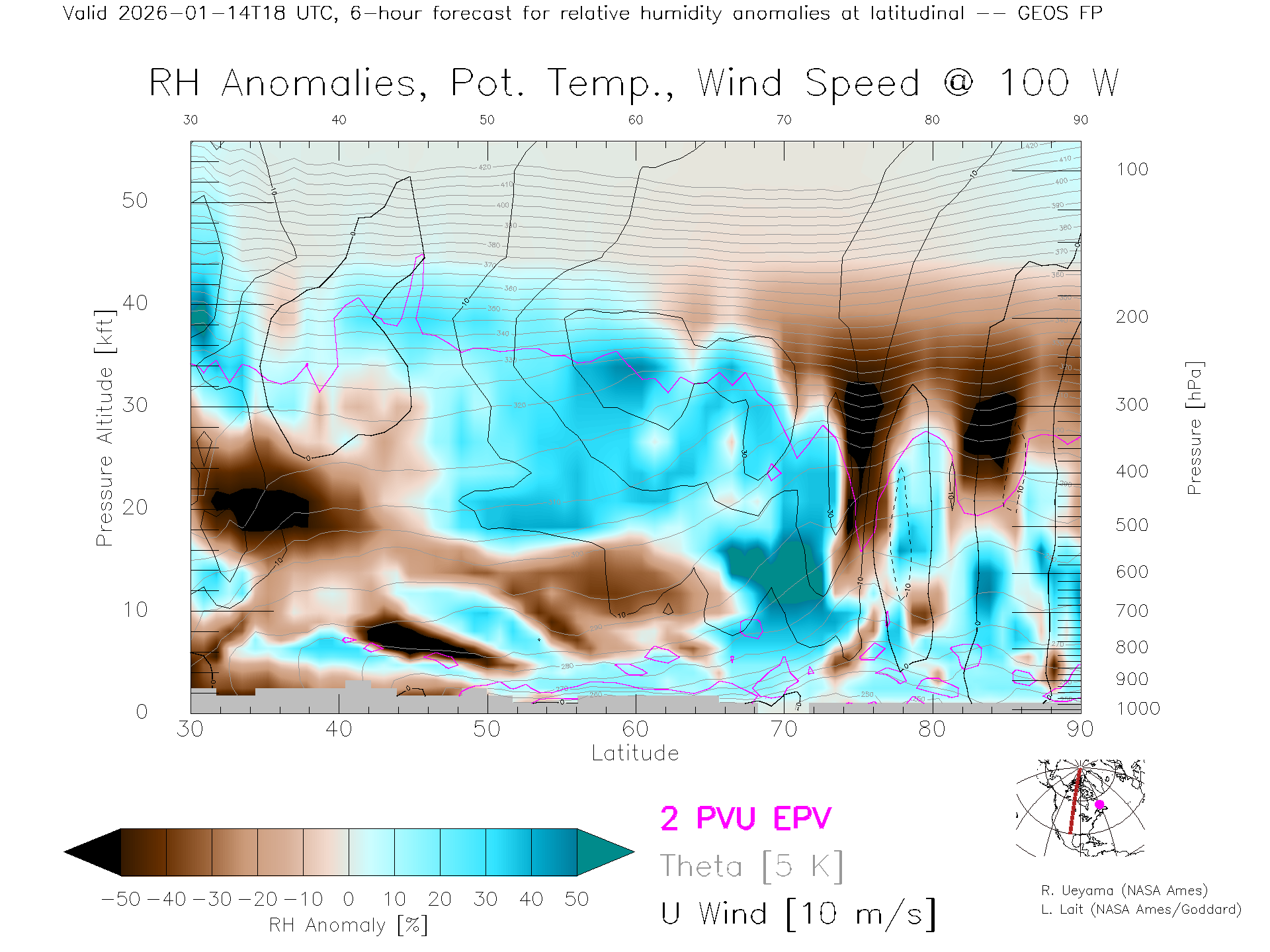 GEOS Forecast Rel. Hum. X-Section (100 W)