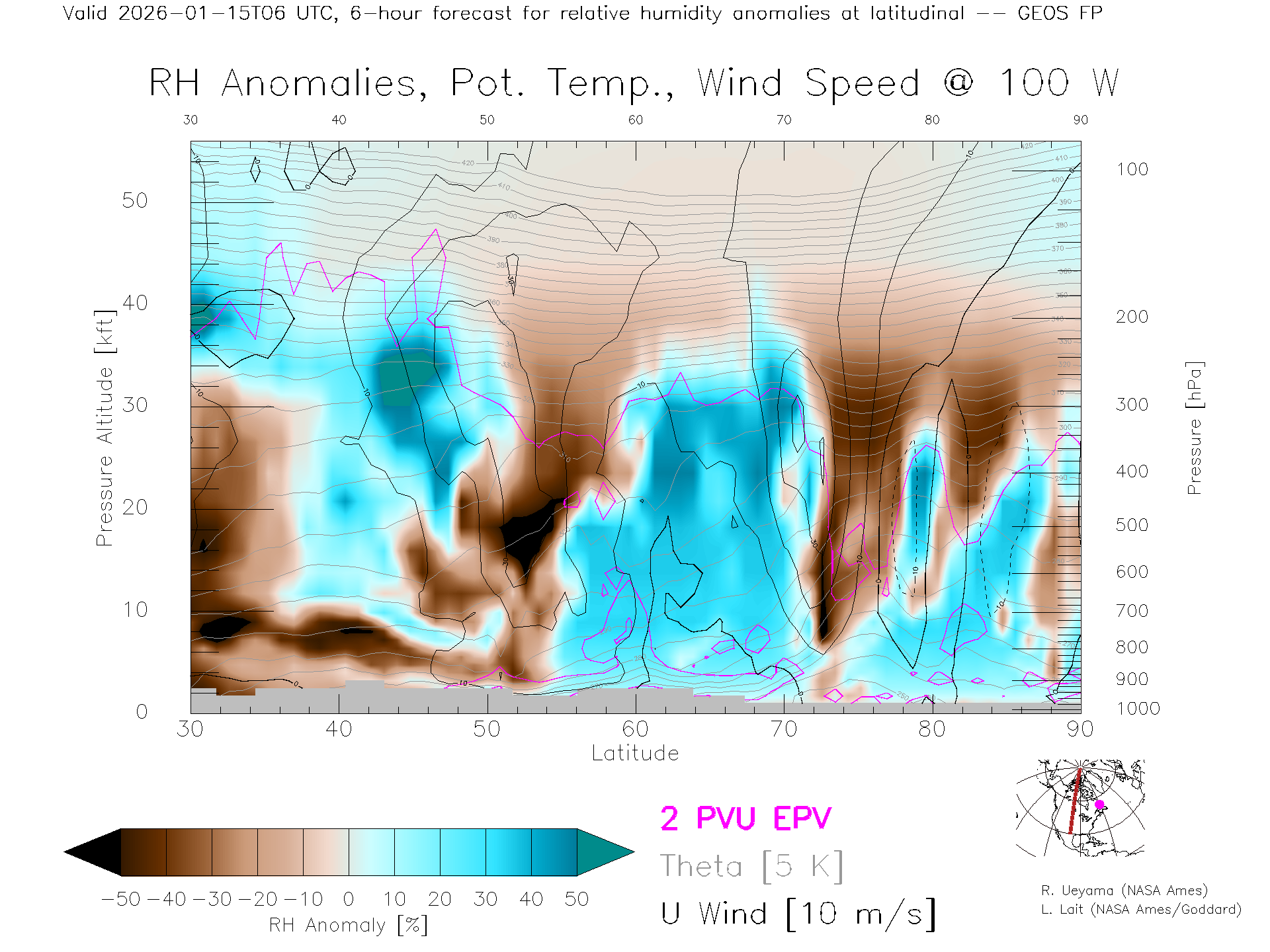 GEOS Forecast Rel. Hum. X-Section (100 W)