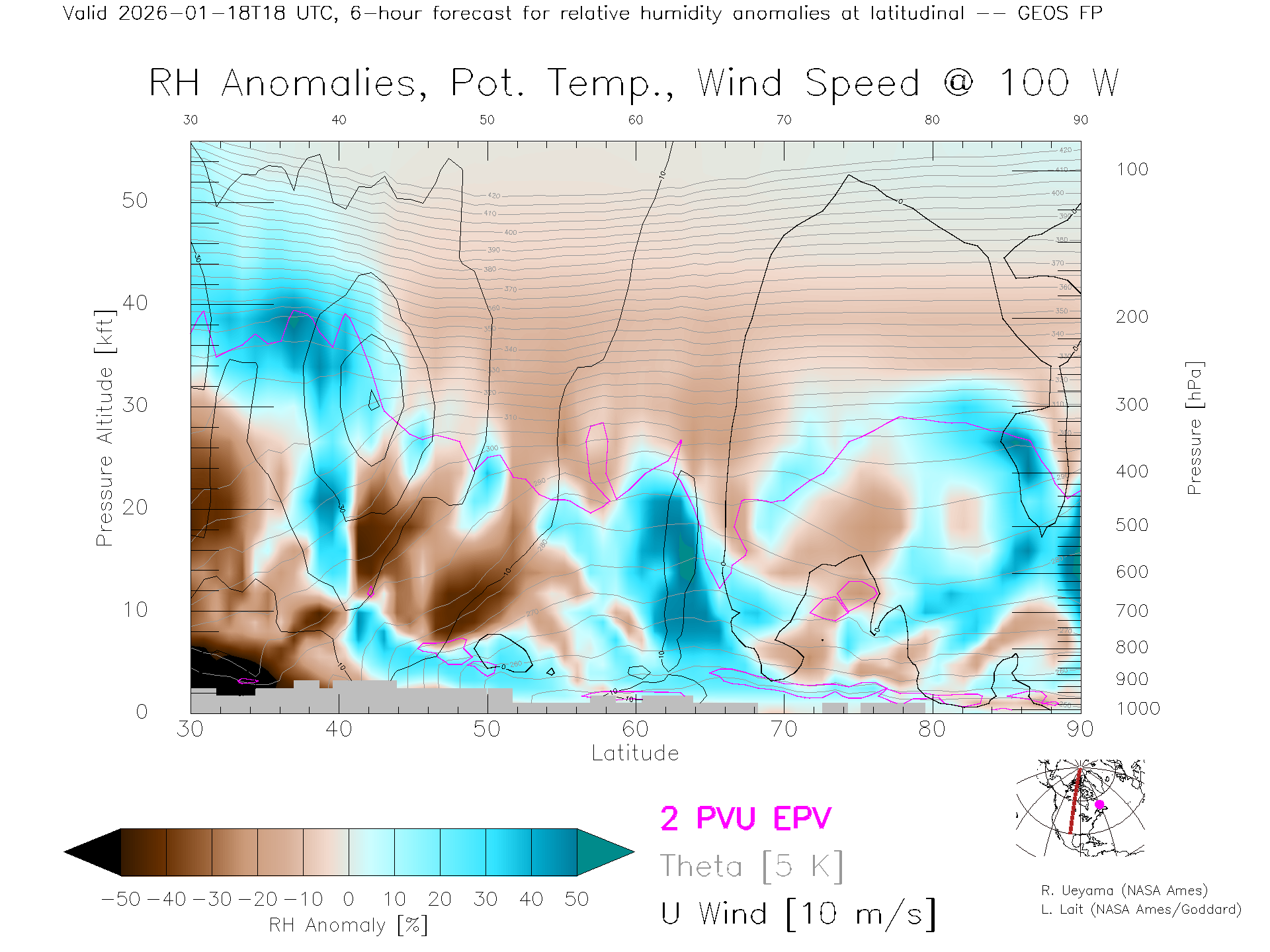 GEOS Forecast Rel. Hum. X-Section (100 W)