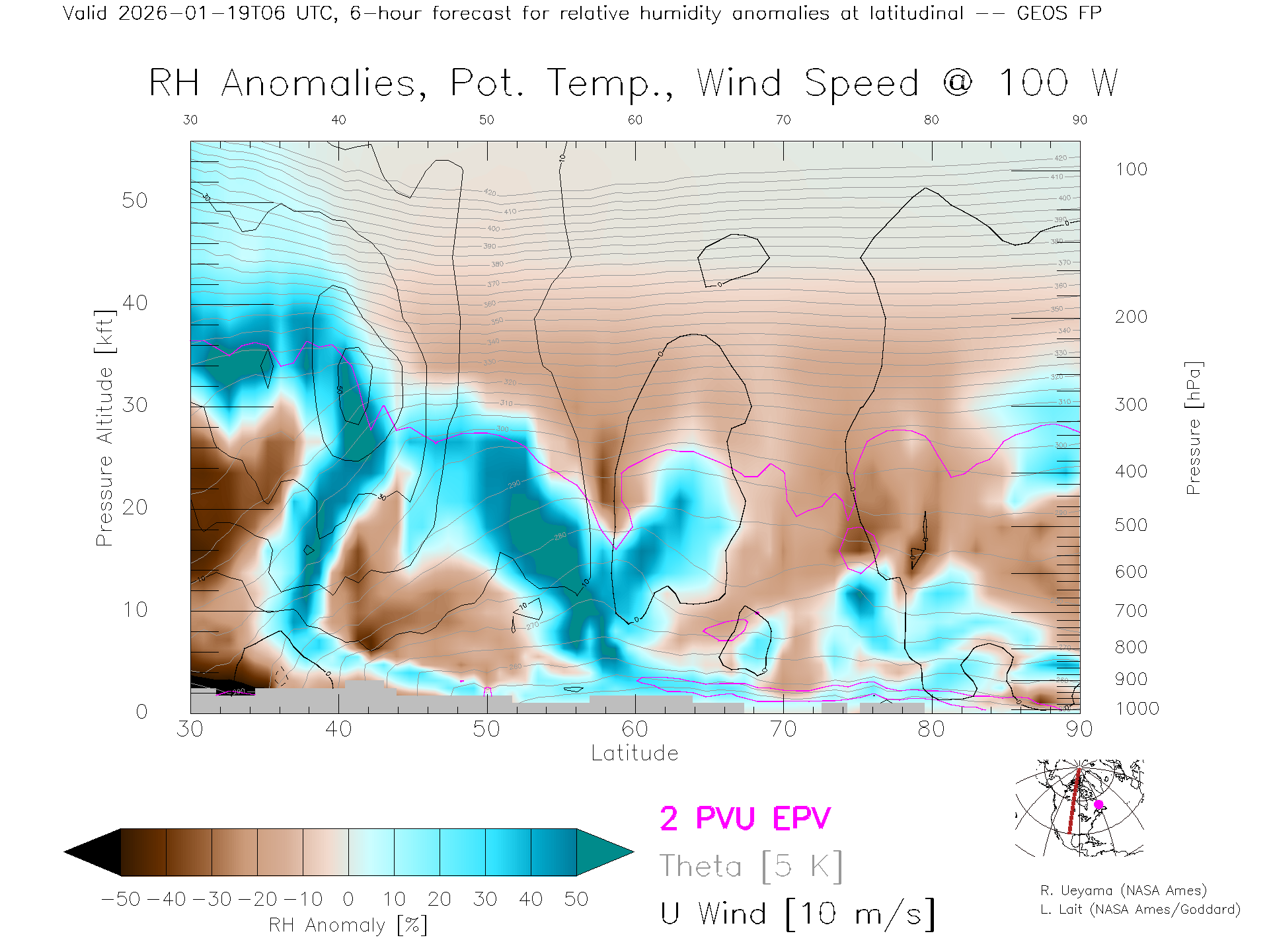GEOS Forecast Rel. Hum. X-Section (100 W)