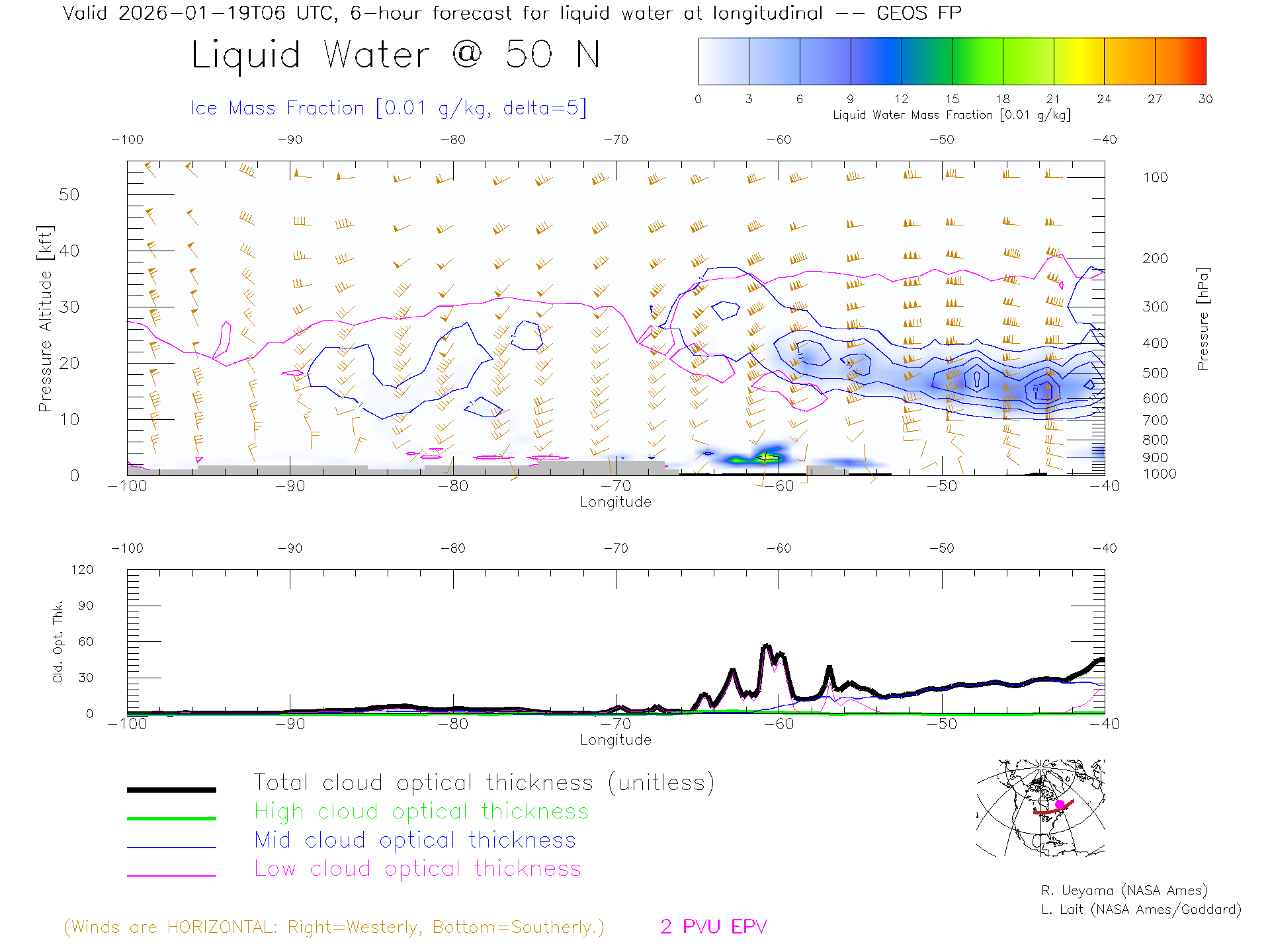 GEOS Forecast Cloud Water Content X-Section (50 N)
