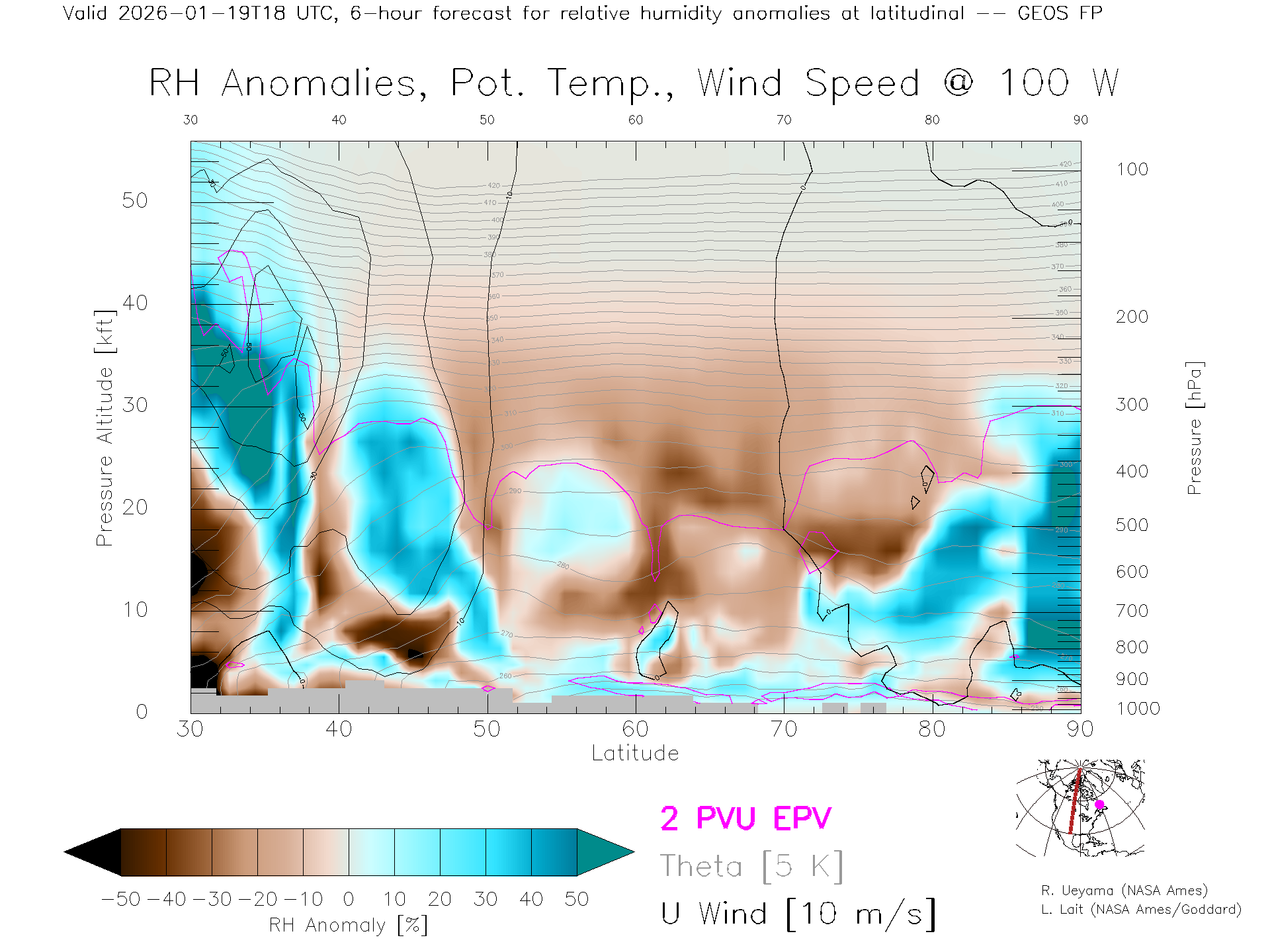 GEOS Forecast Rel. Hum. X-Section (100 W)