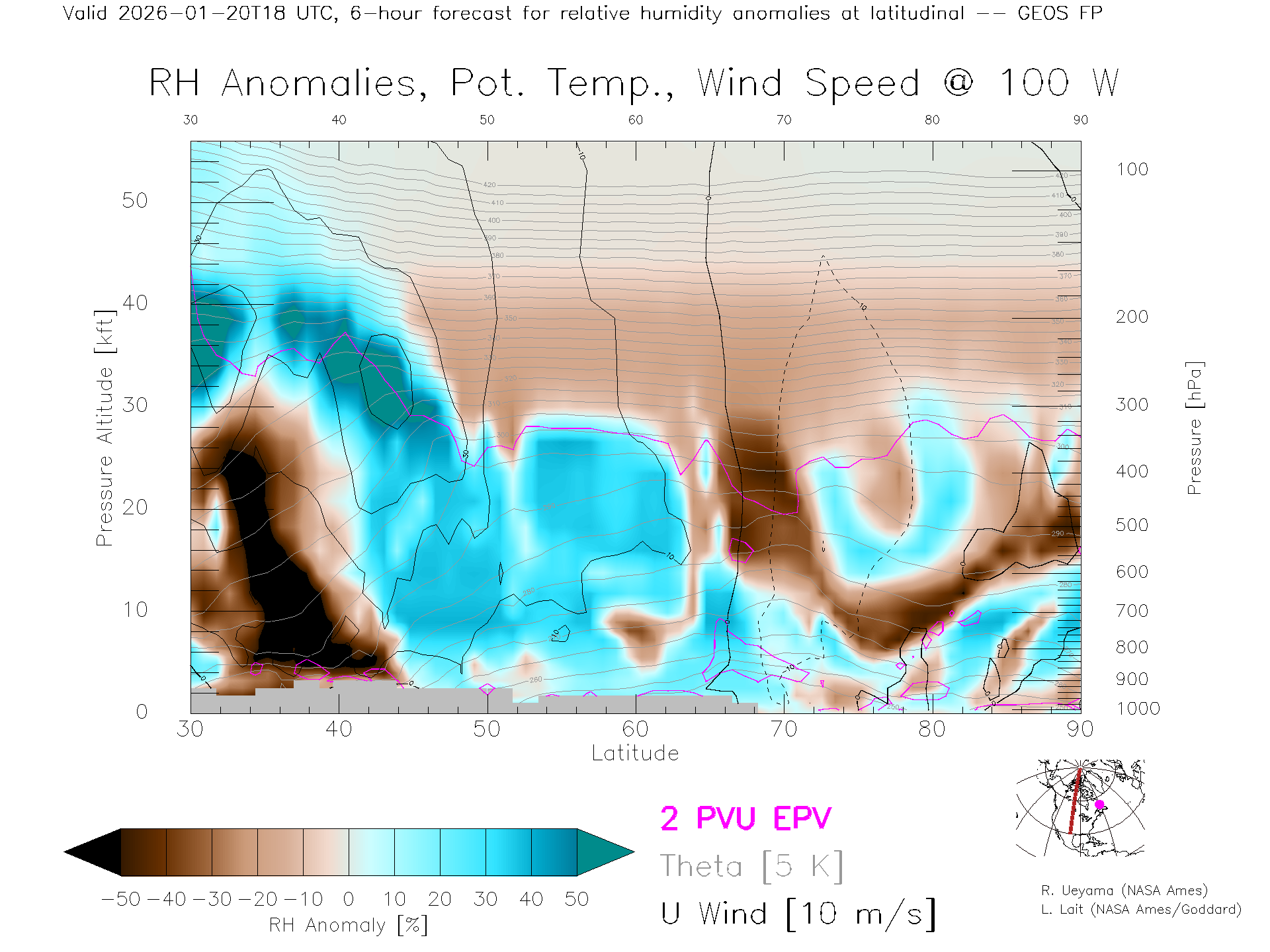 GEOS Forecast Rel. Hum. X-Section (100 W)