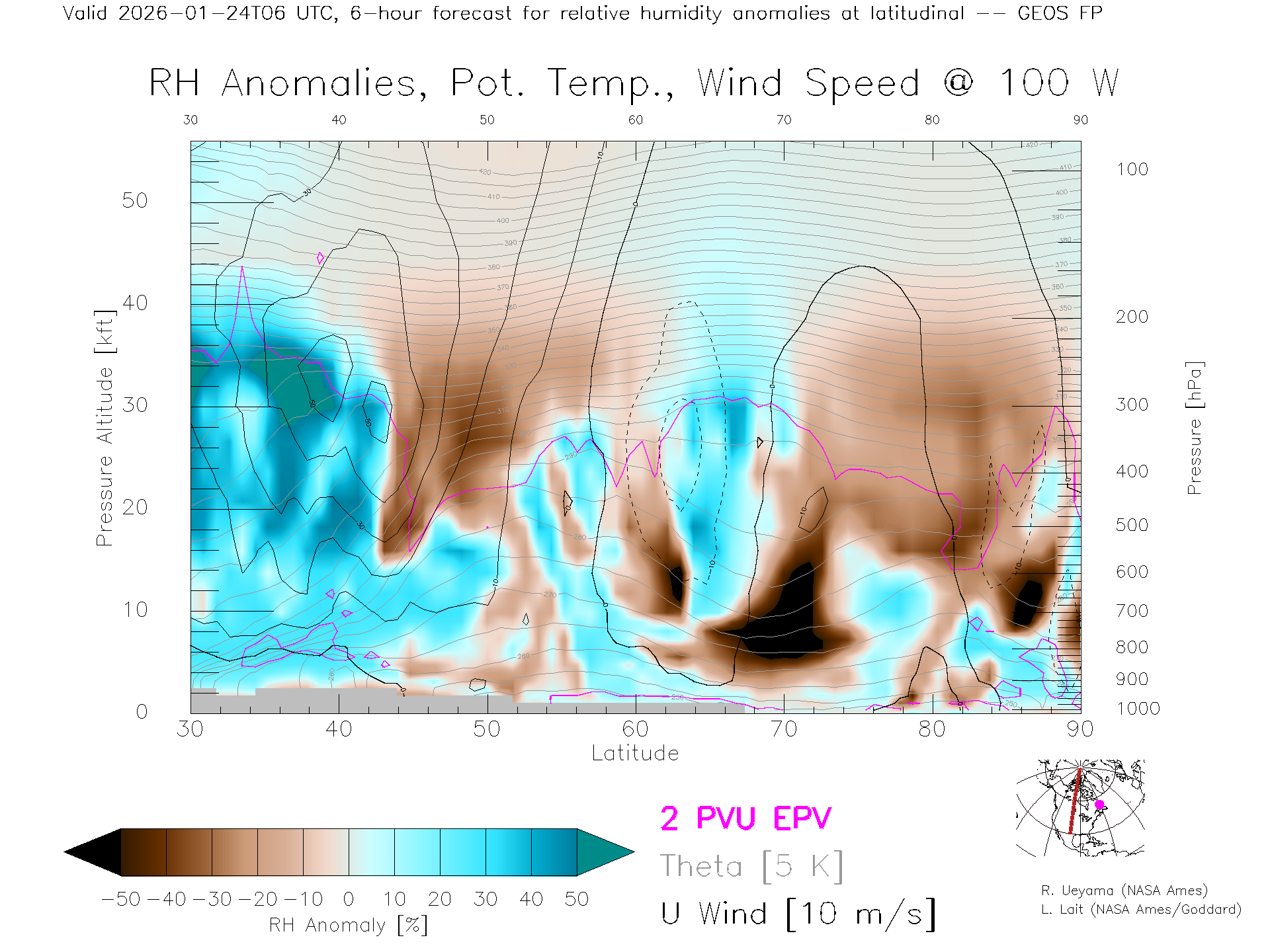 GEOS Forecast Rel. Hum. X-Section (100 W)