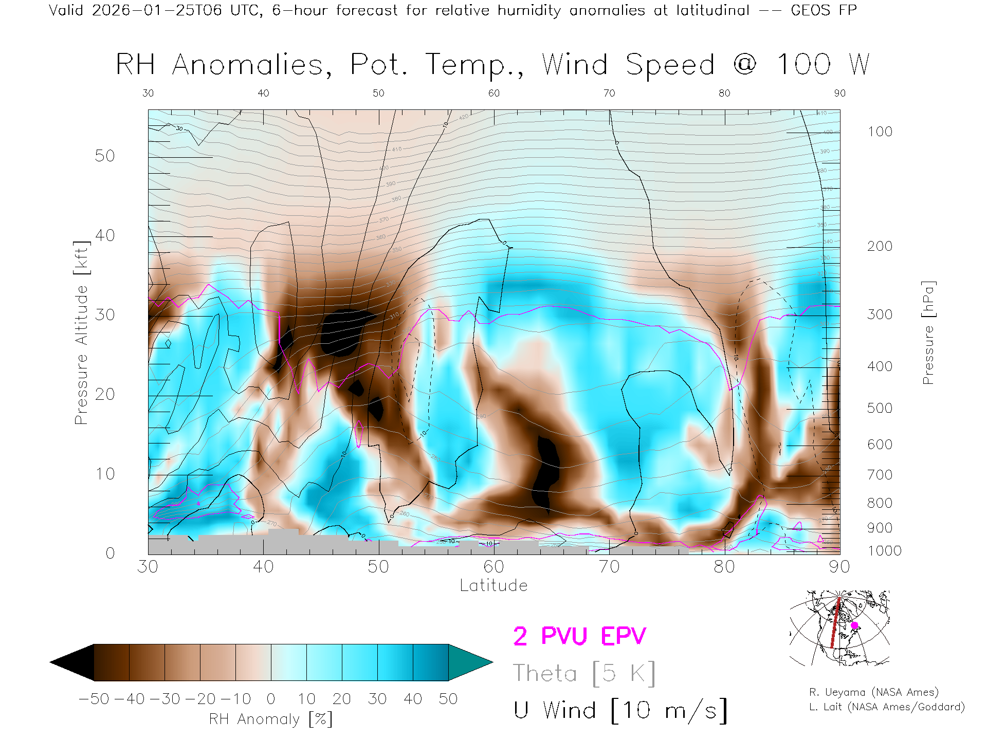 GEOS Forecast Rel. Hum. X-Section (100 W)