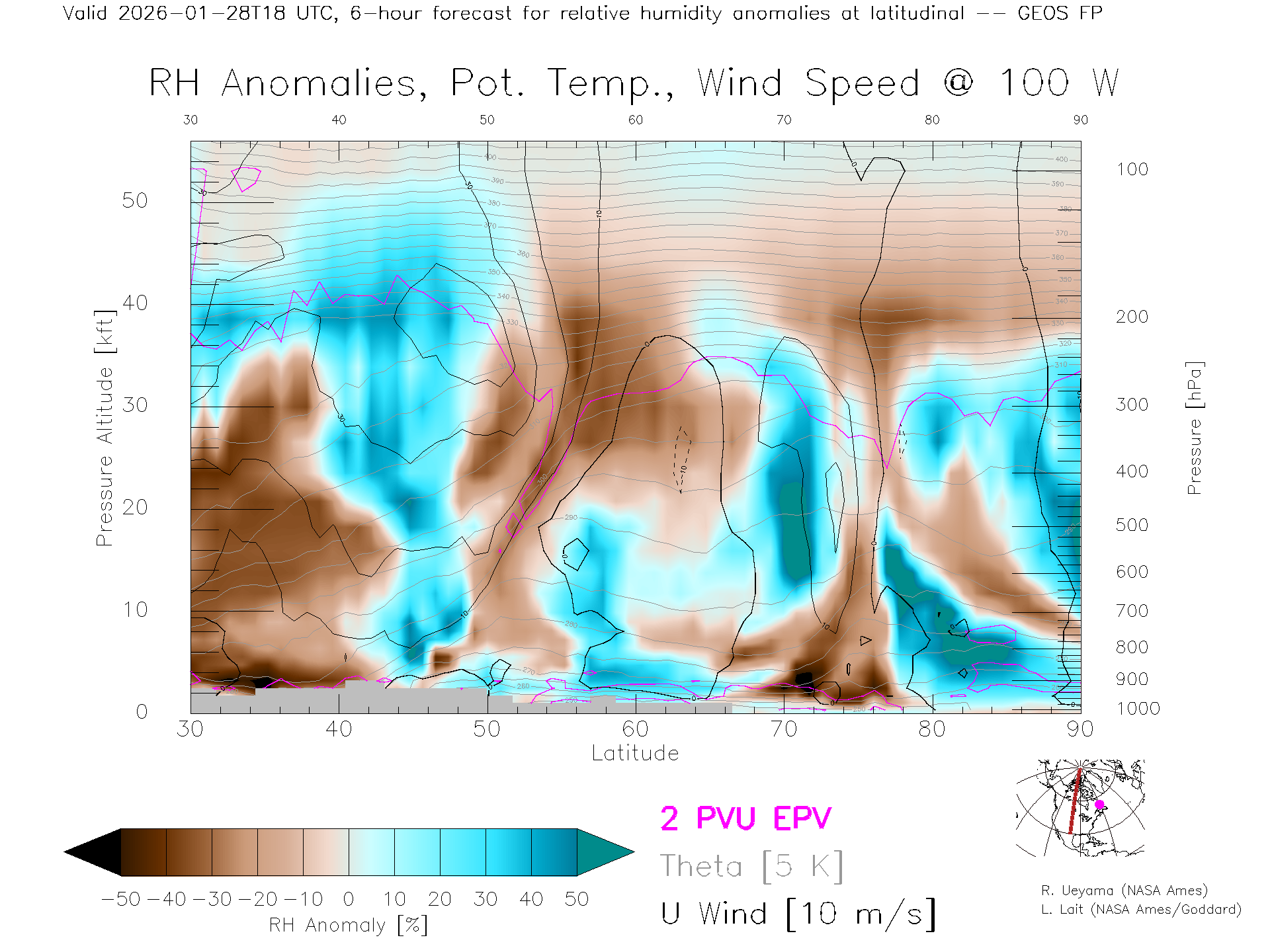 GEOS Forecast Rel. Hum. X-Section (100 W)
