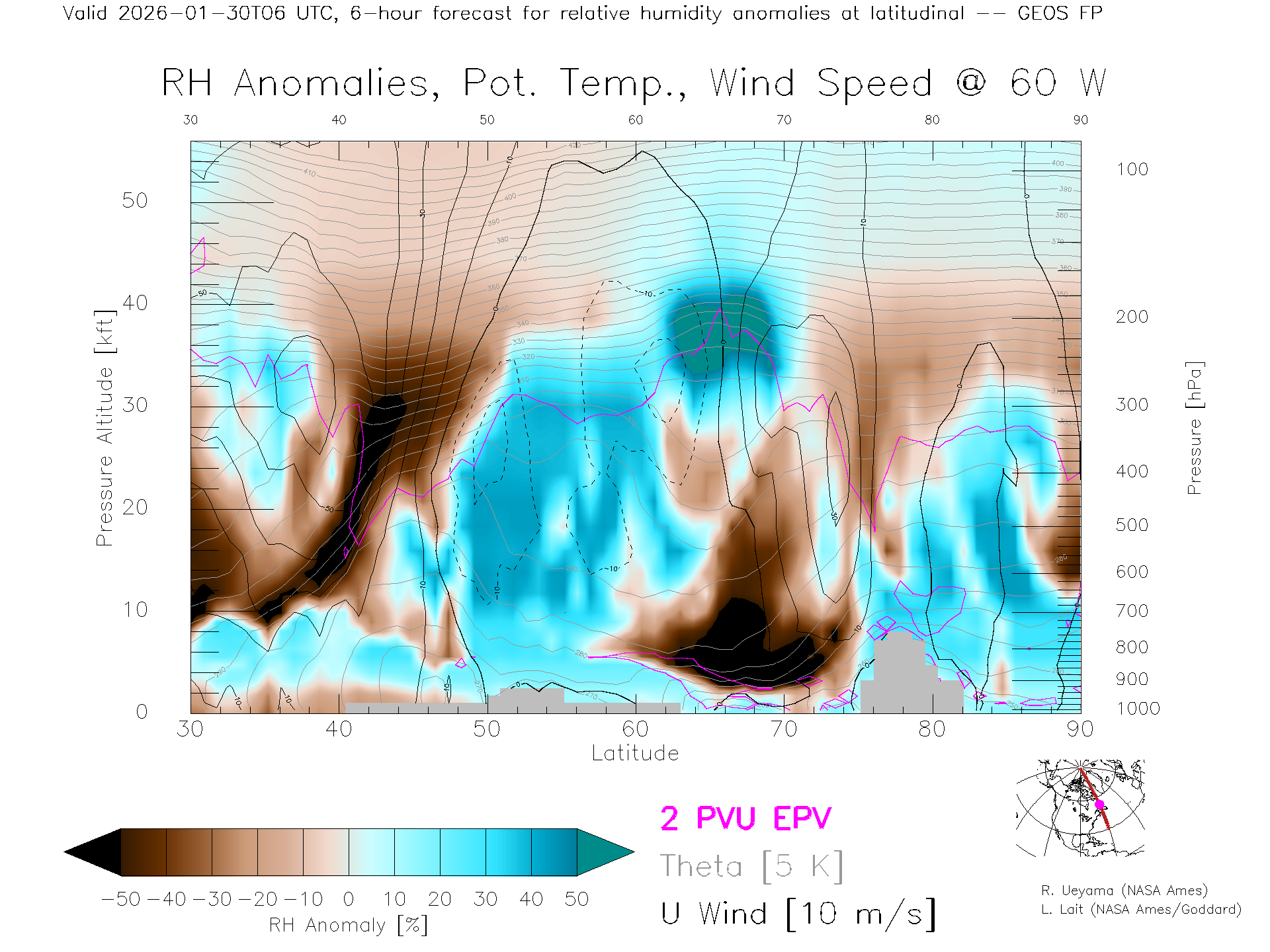 GEOS Forecast Rel. Hum. X-Section (60 W)