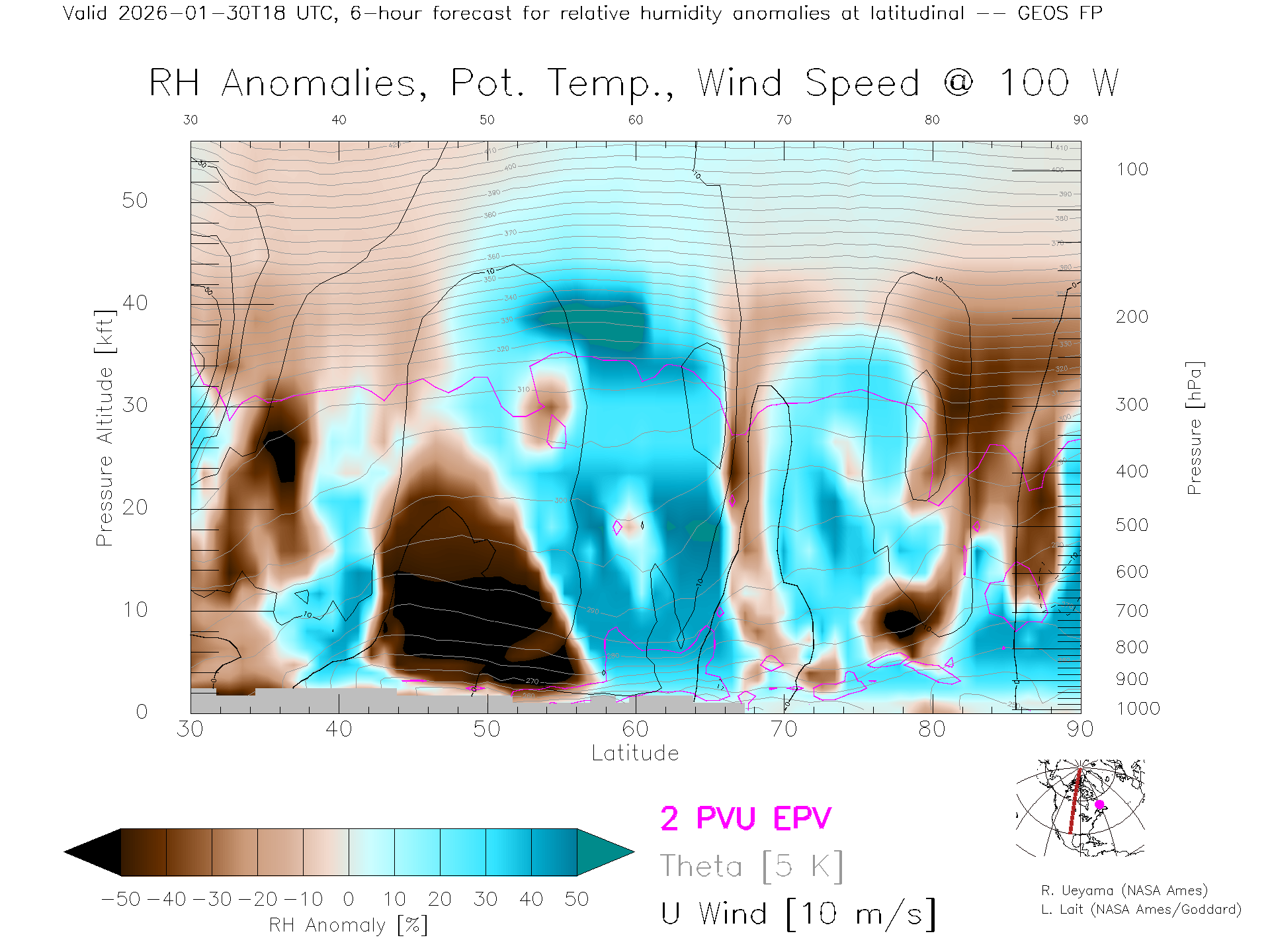 GEOS Forecast Rel. Hum. X-Section (100 W)