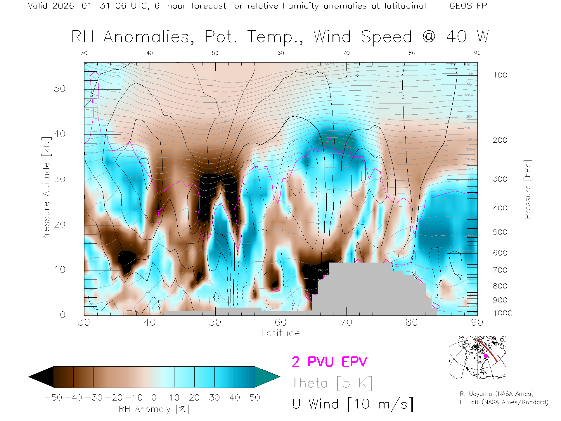 GEOS Forecast Rel. Hum. X-Section (40 W)