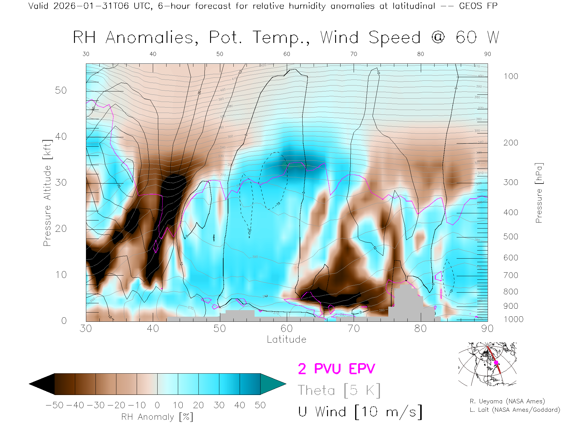 GEOS Forecast Rel. Hum. X-Section (60 W)
