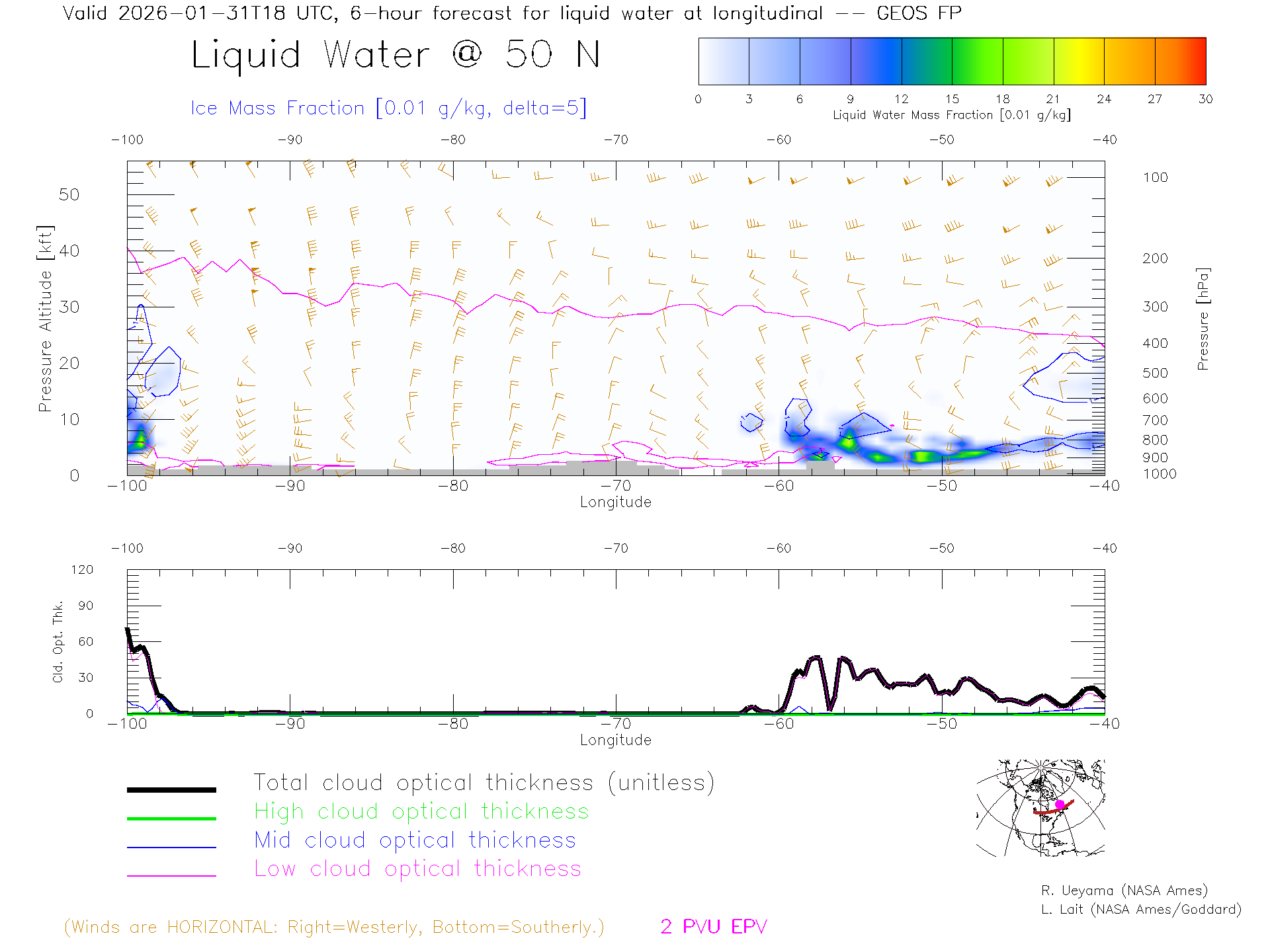 GEOS Forecast Cloud Water Content X-Section (50 N)
