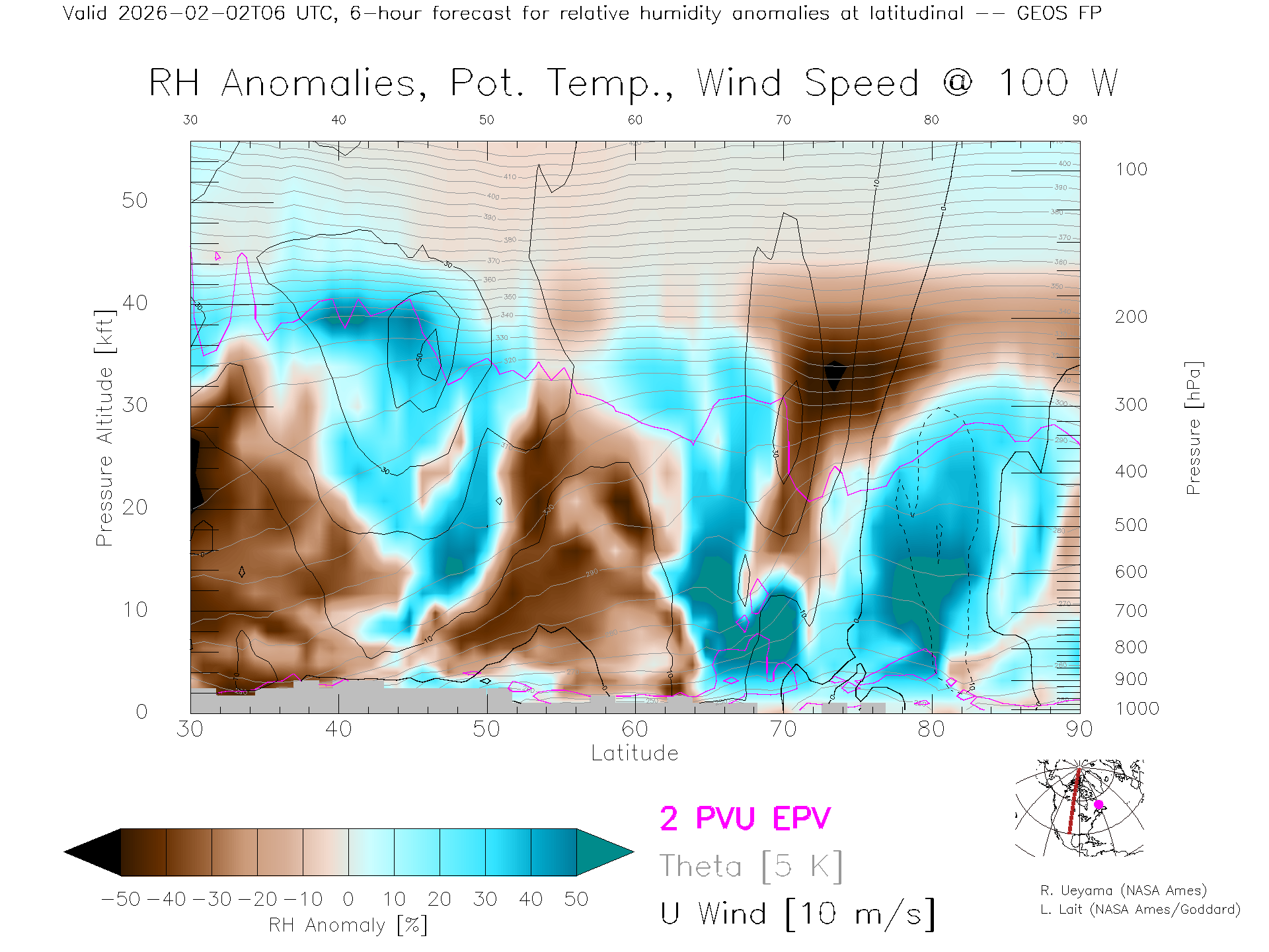 GEOS Forecast Rel. Hum. X-Section (100 W)