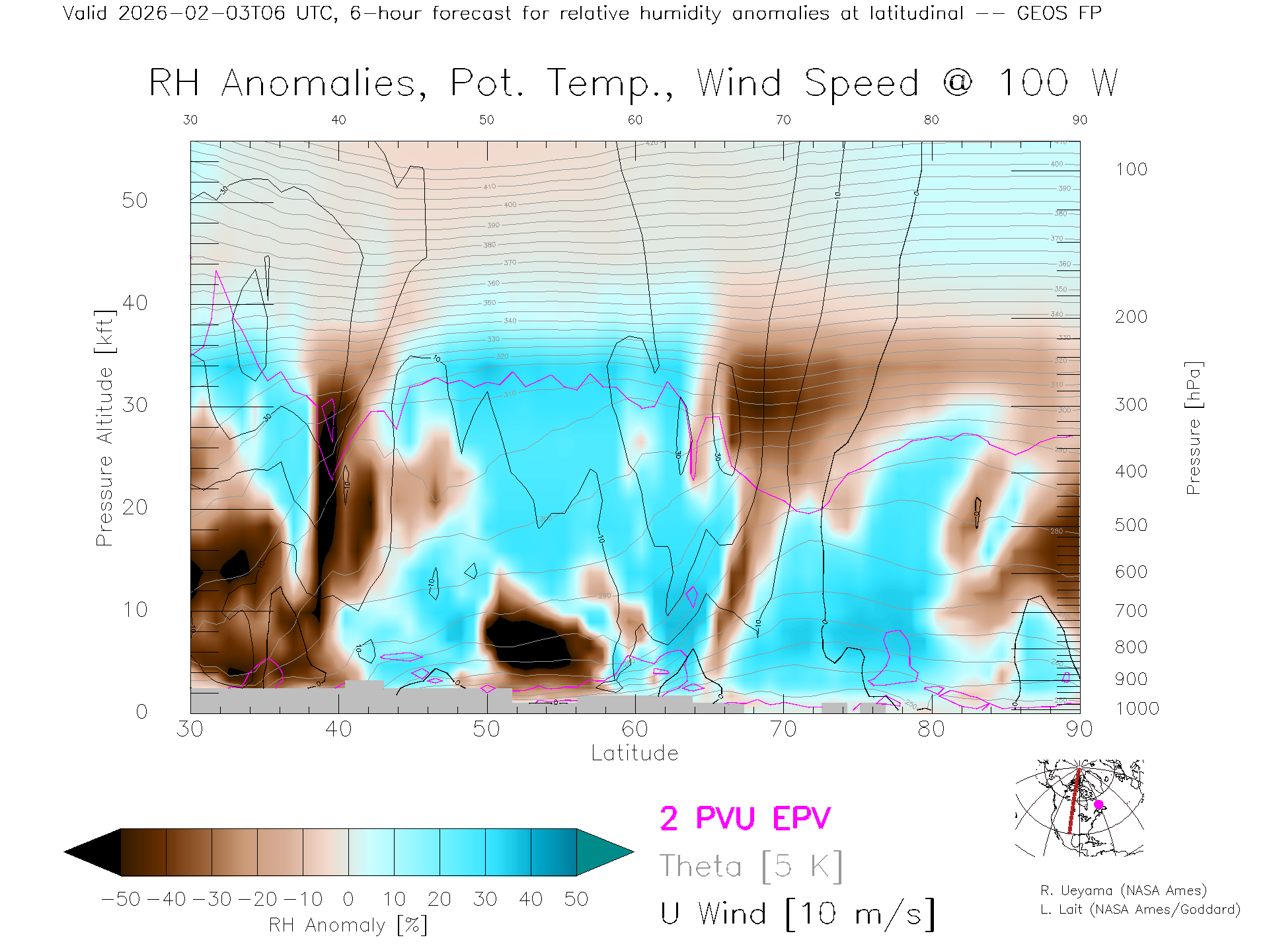 GEOS Forecast Rel. Hum. X-Section (100 W)