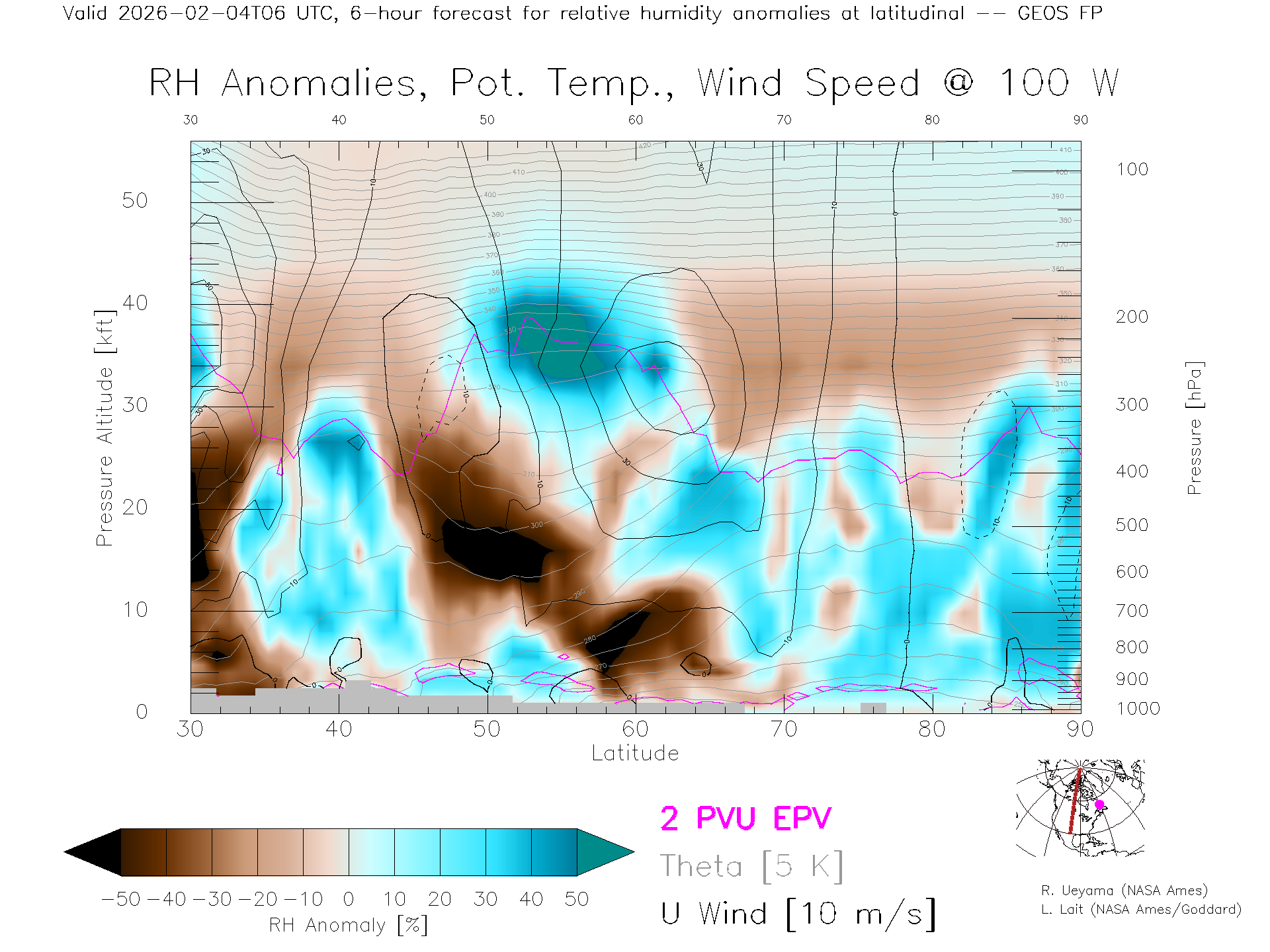 GEOS Forecast Rel. Hum. X-Section (100 W)