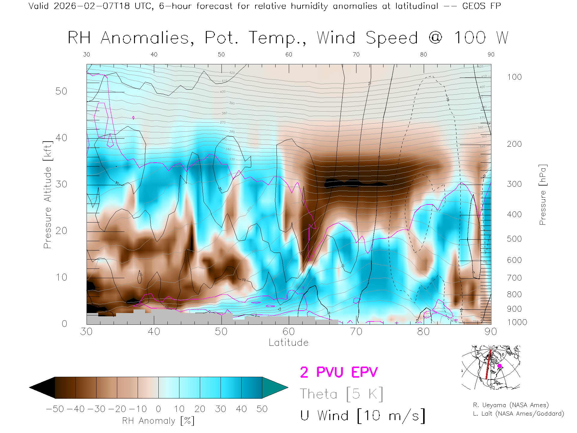 GEOS Forecast Rel. Hum. X-Section (100 W)