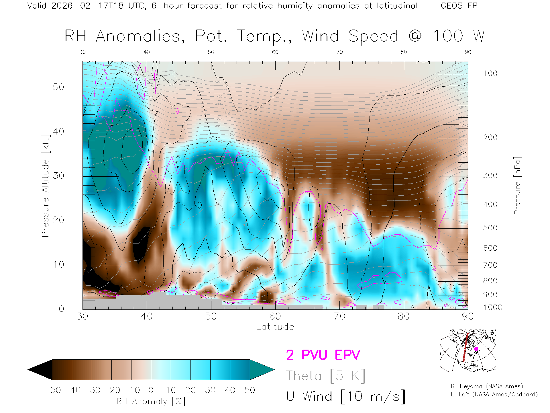 GEOS Forecast Rel. Hum. X-Section (100 W)
