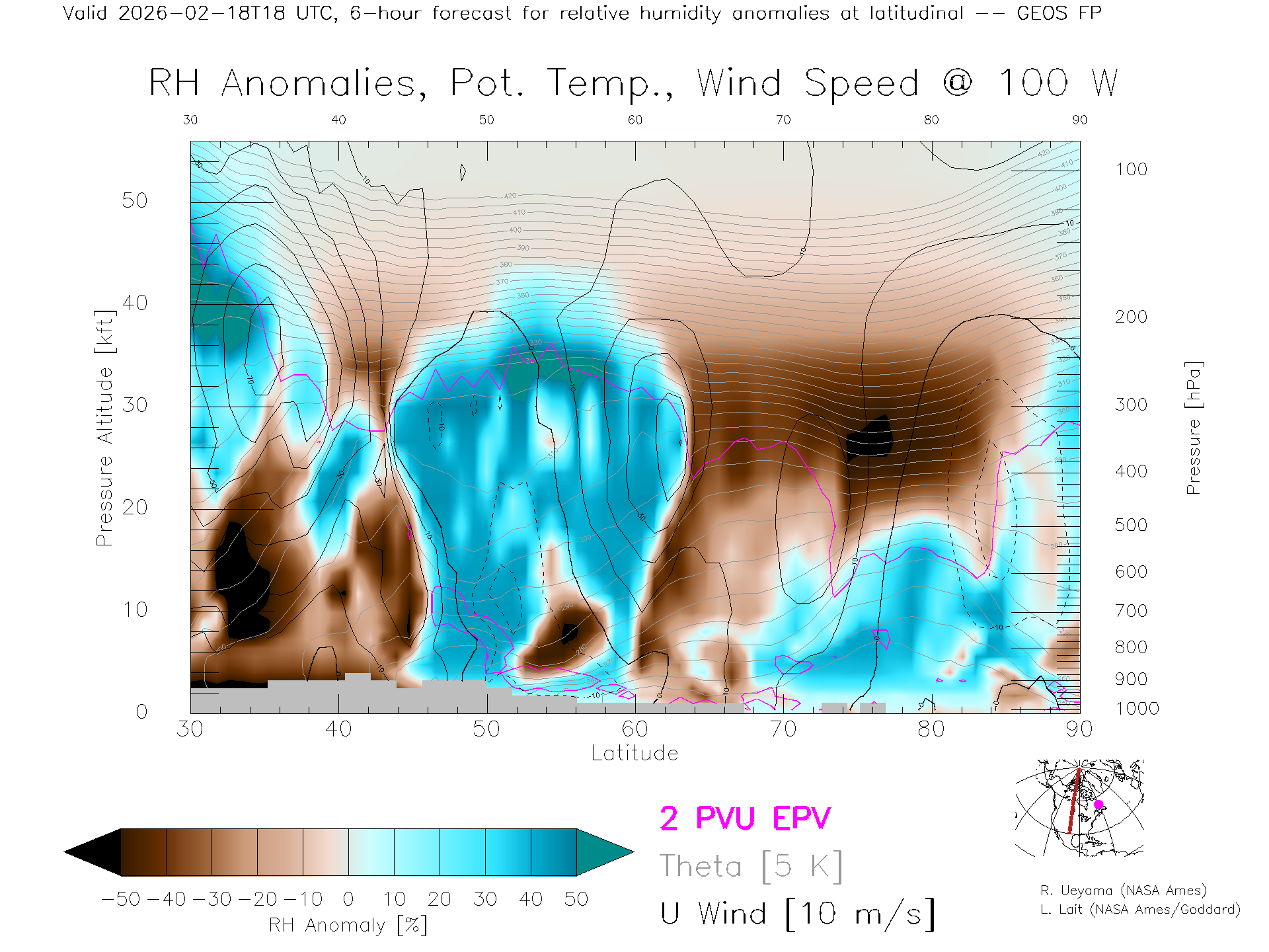 GEOS Forecast Rel. Hum. X-Section (100 W)