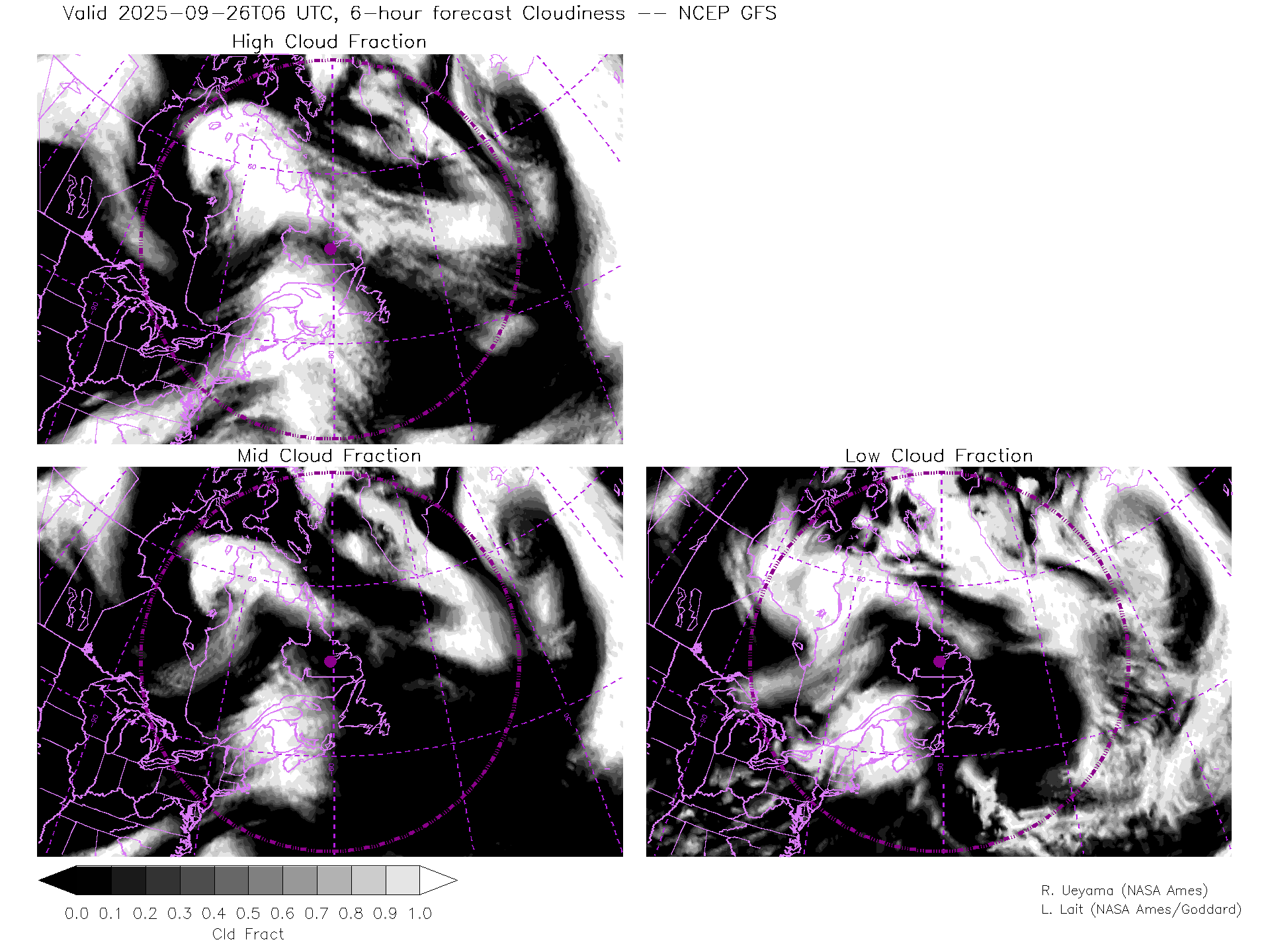 NCEP GFS Forecast Cloud Fraction (High, Mid, Low) & High Cloud Optical Thickness