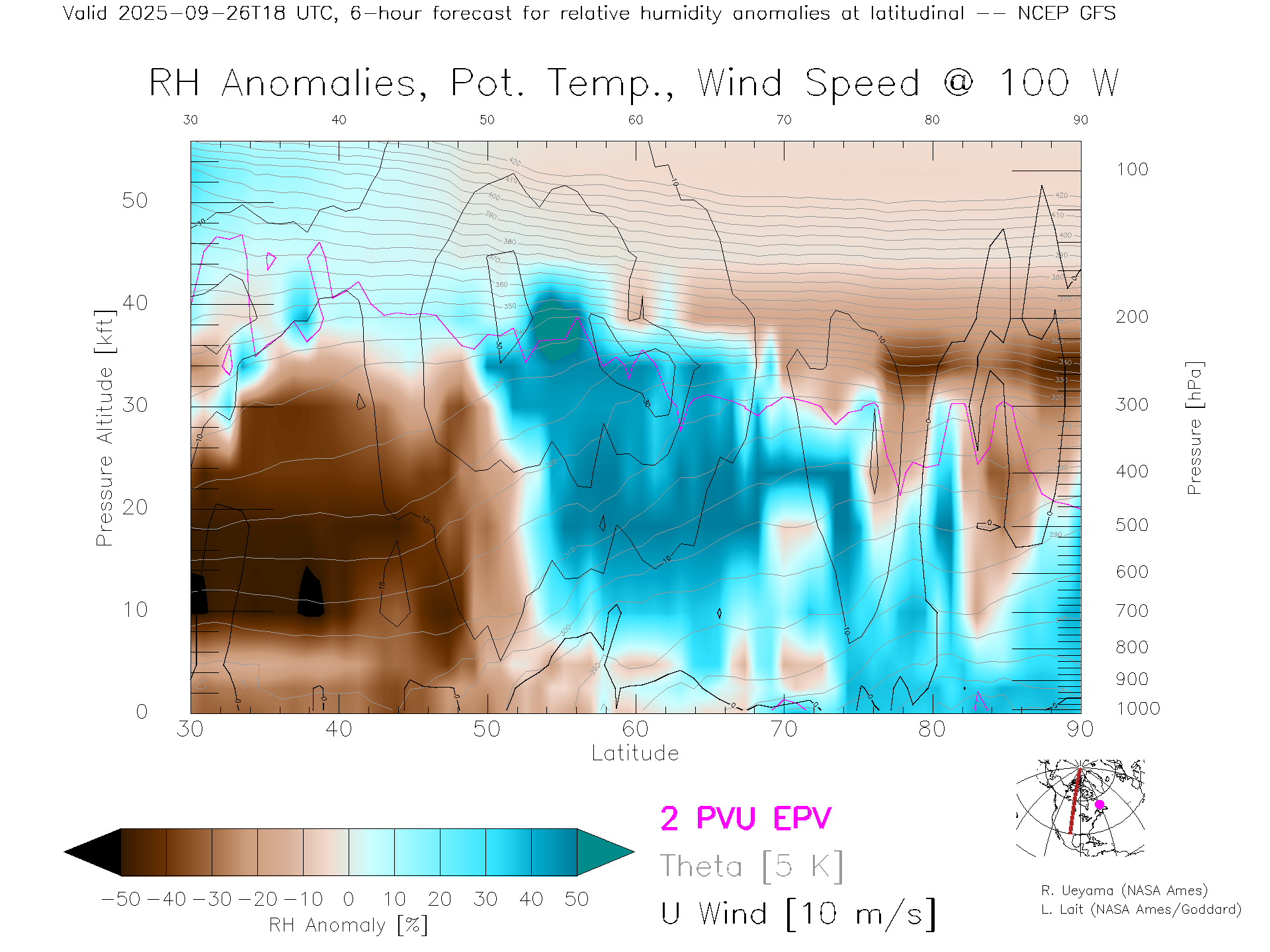 NCEP GFS Forecast Rel. Hum. X-Section (100 W)