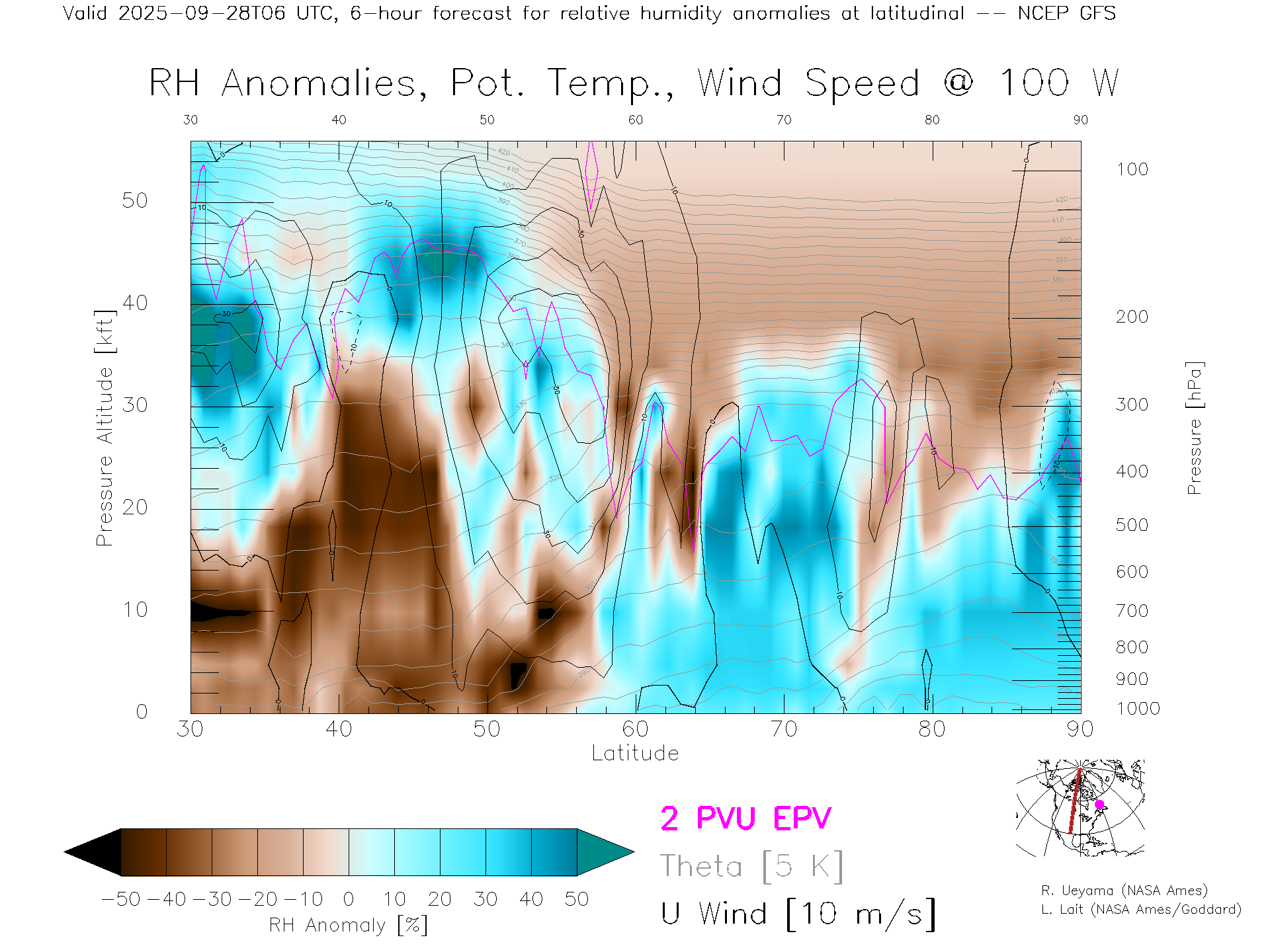 NCEP GFS Forecast Rel. Hum. X-Section (100 W)