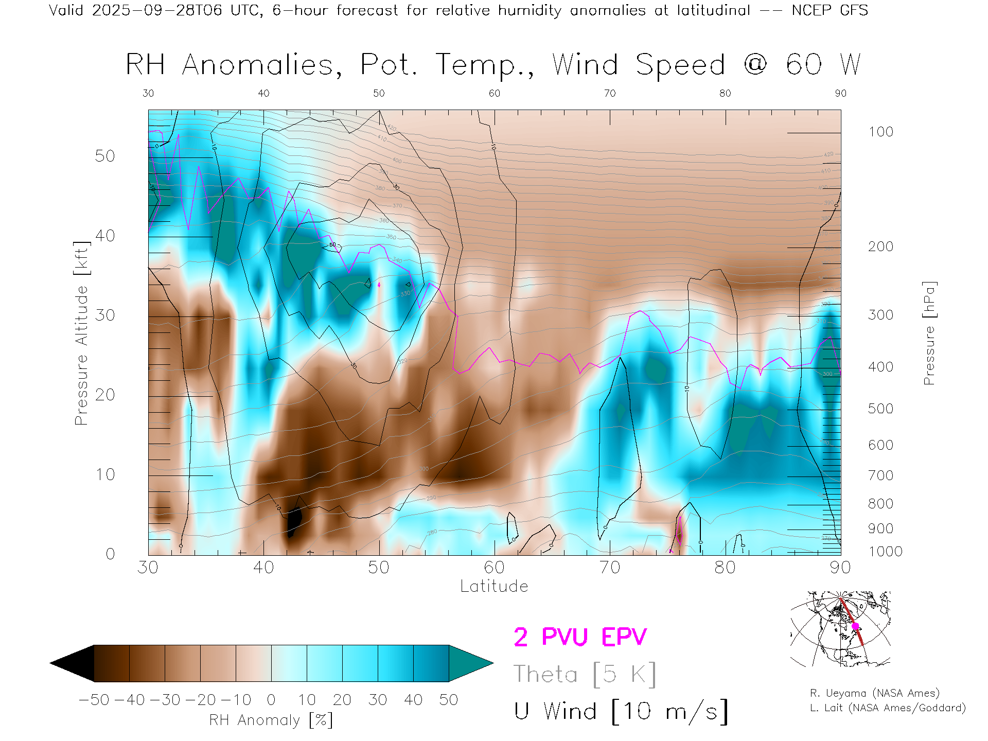 NCEP GFS Forecast Rel. Hum. X-Section (60 W)