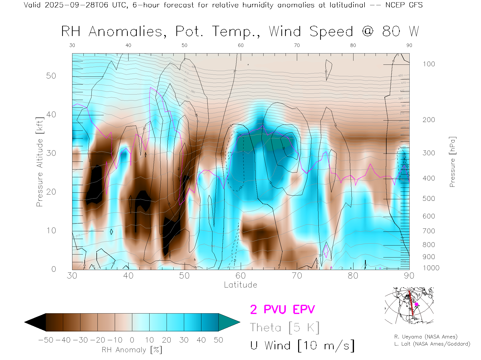 NCEP GFS Forecast Rel. Hum. X-Section (80 W)