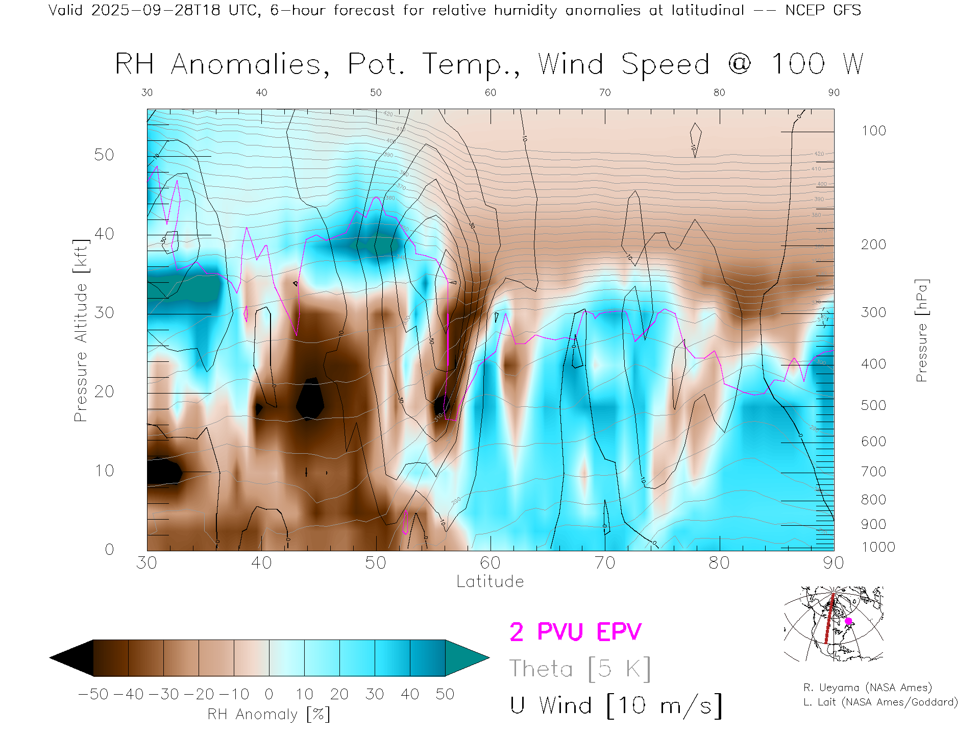 NCEP GFS Forecast Rel. Hum. X-Section (100 W)