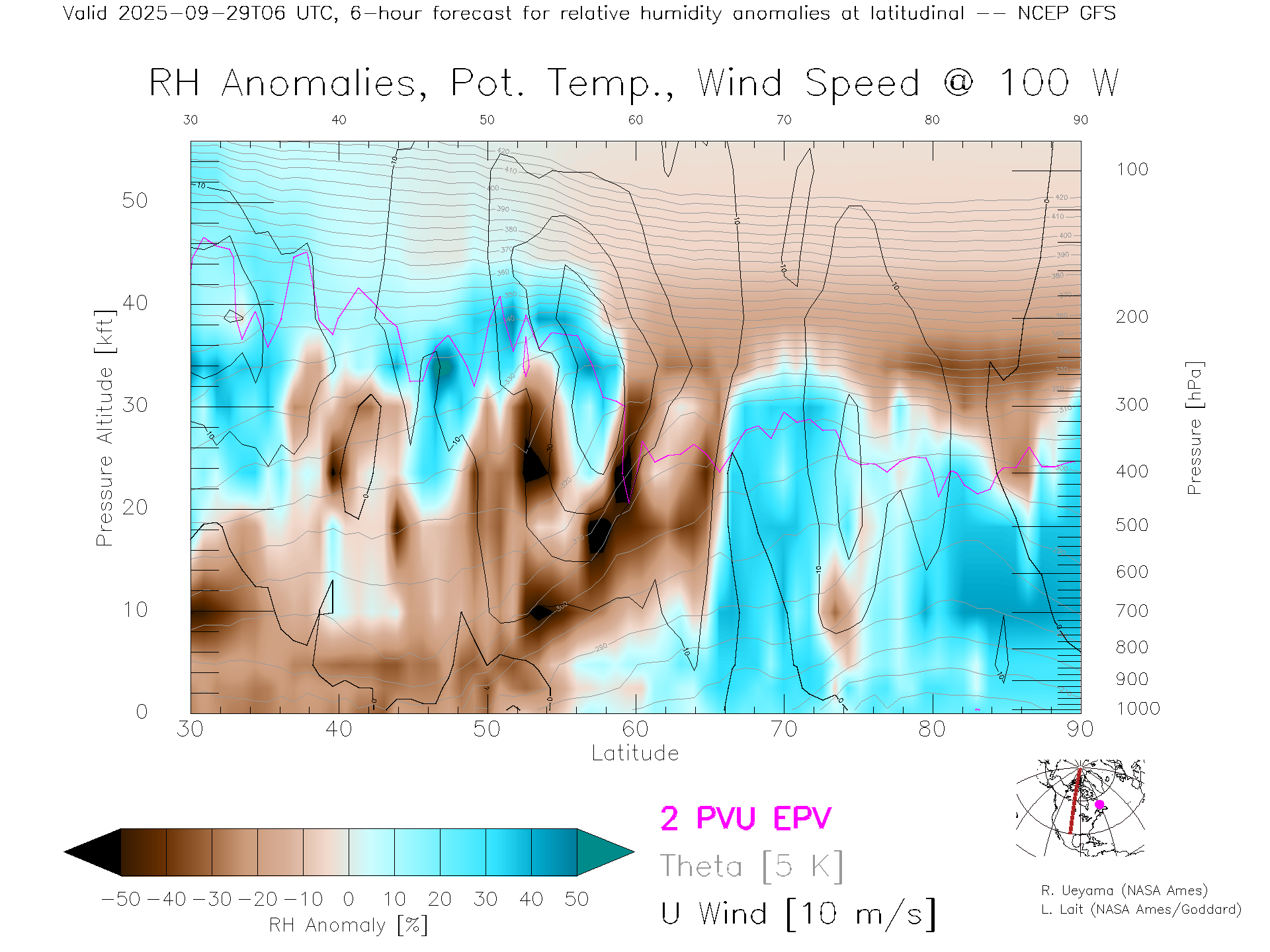 NCEP GFS Forecast Rel. Hum. X-Section (100 W)