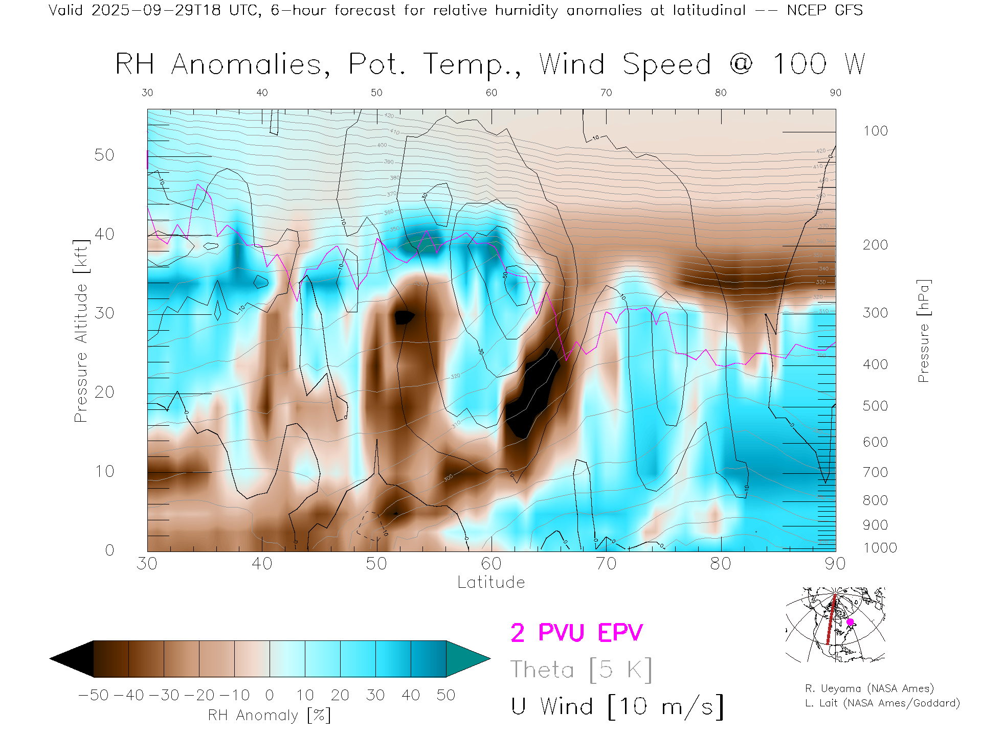 NCEP GFS Forecast Rel. Hum. X-Section (100 W)