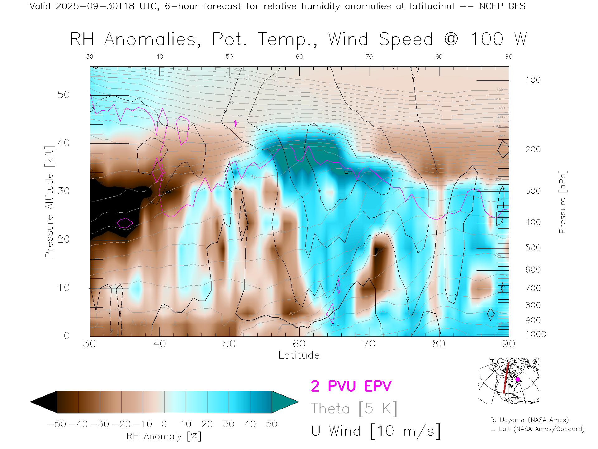 NCEP GFS Forecast Rel. Hum. X-Section (100 W)