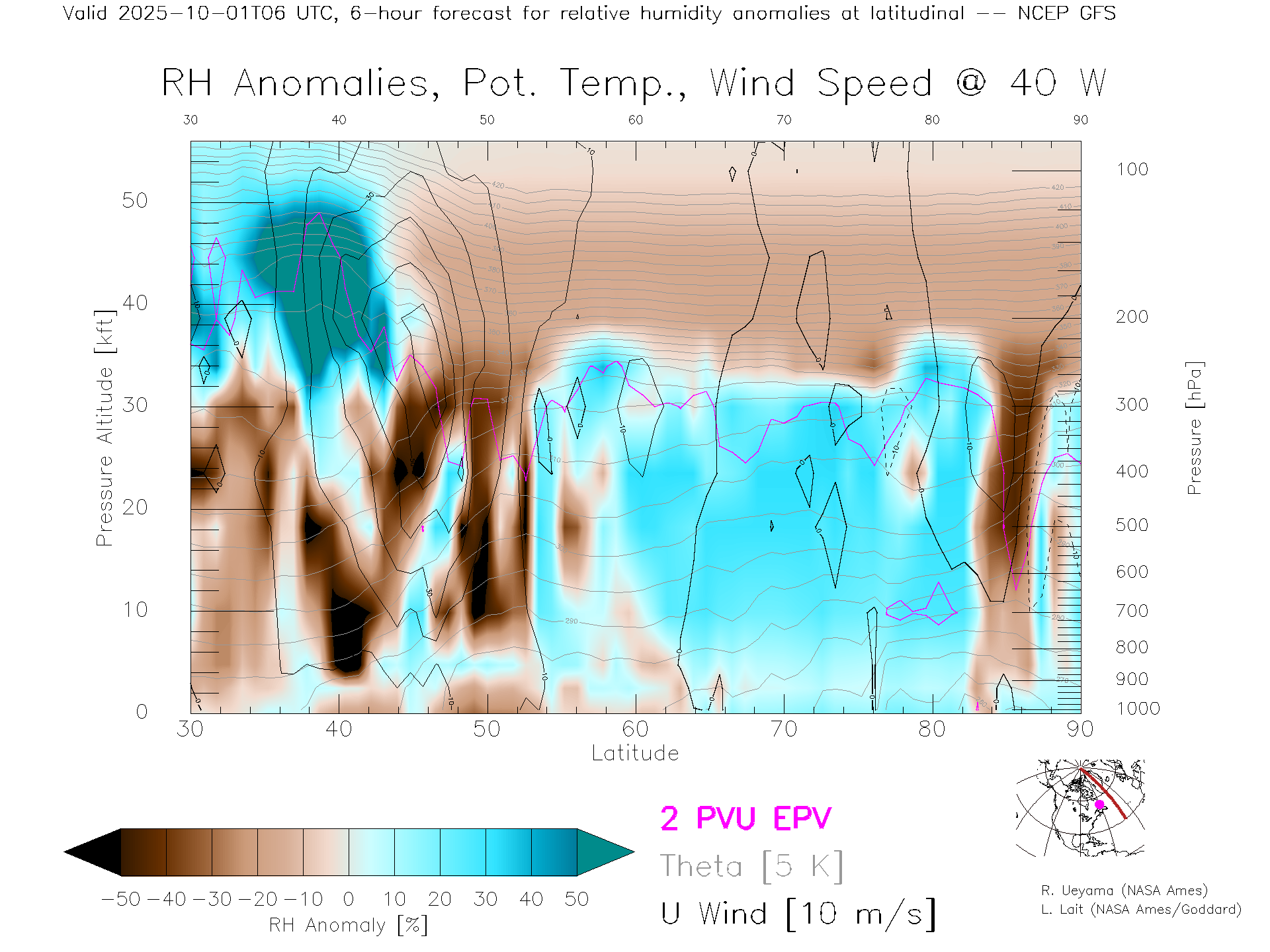 NCEP GFS Forecast Rel. Hum. X-Section (40 W)