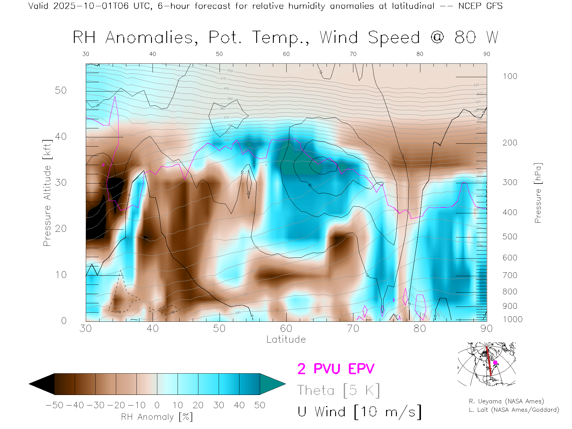 NCEP GFS Forecast Rel. Hum. X-Section (80 W)