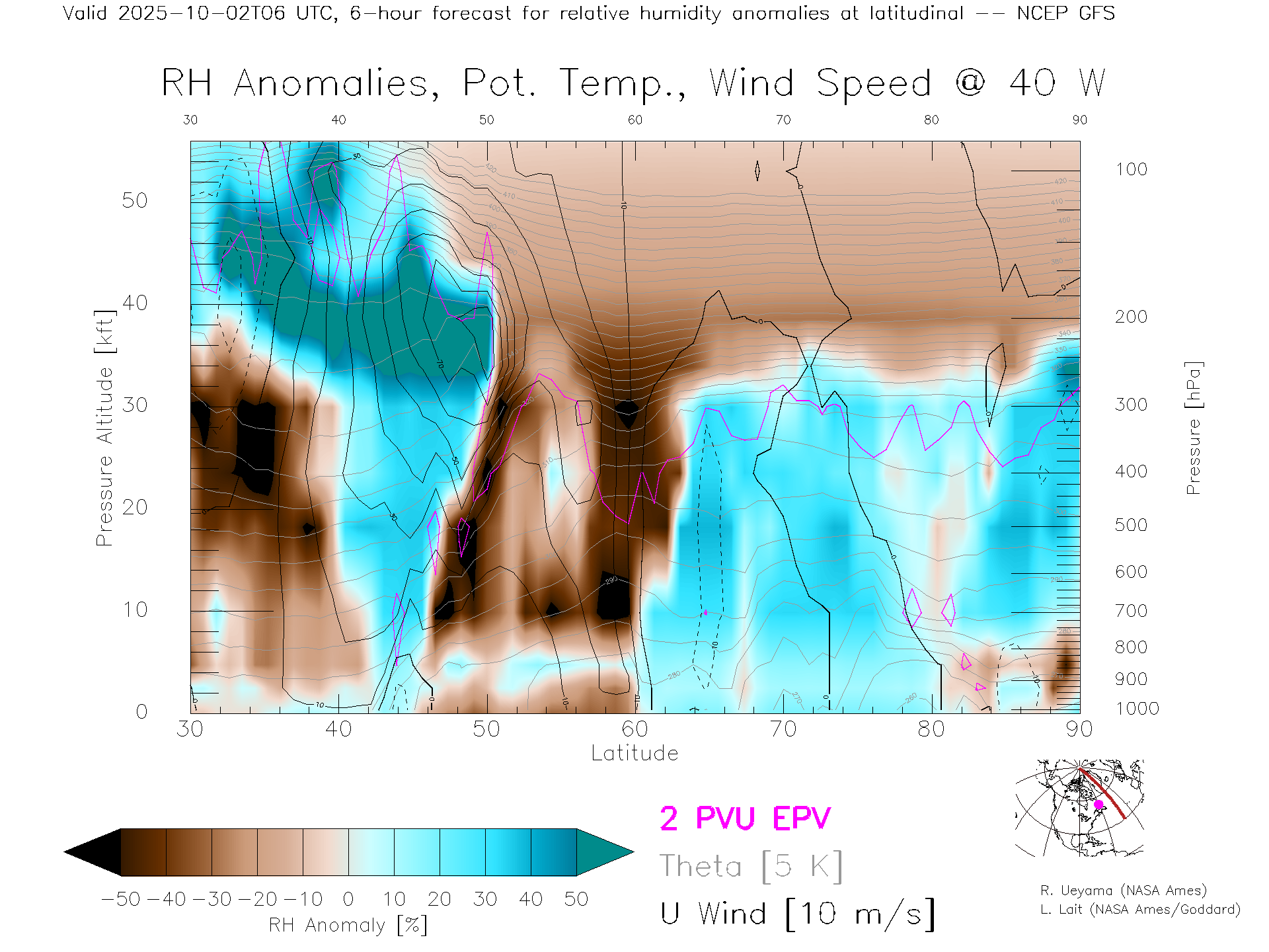 NCEP GFS Forecast Rel. Hum. X-Section (40 W)