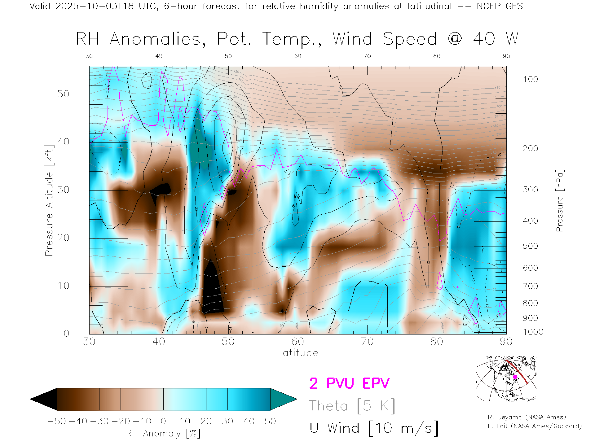 NCEP GFS Forecast Rel. Hum. X-Section (40 W)