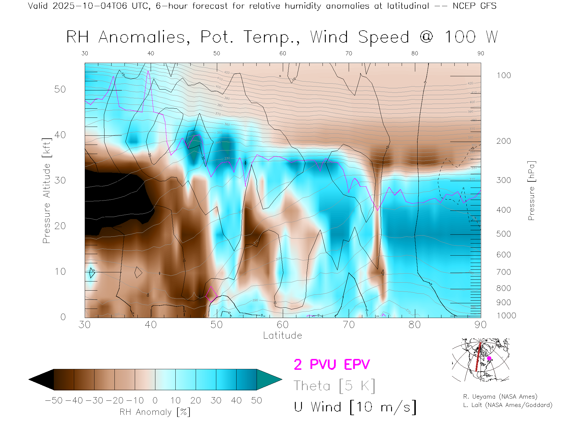 NCEP GFS Forecast Rel. Hum. X-Section (100 W)