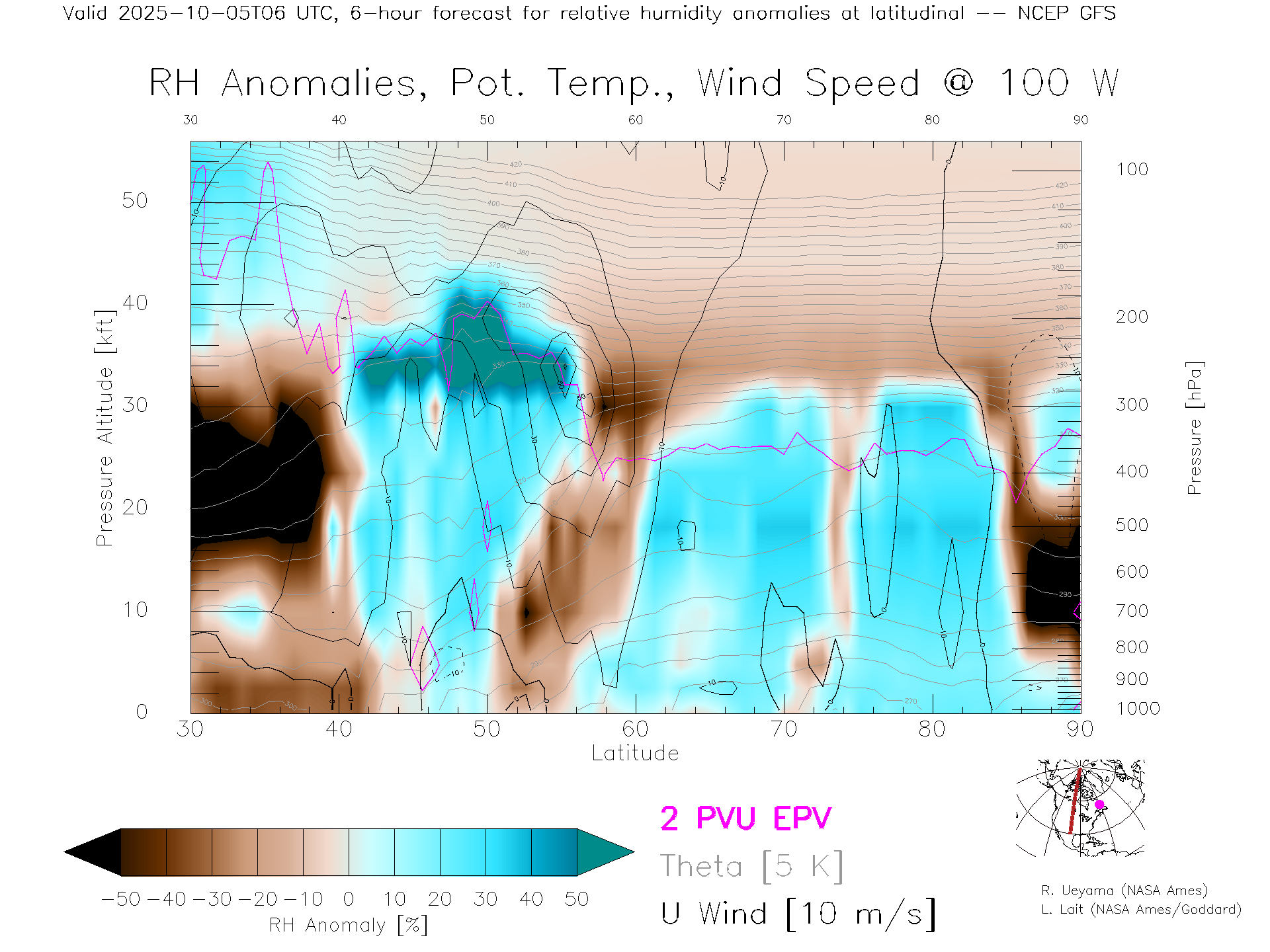 NCEP GFS Forecast Rel. Hum. X-Section (100 W)