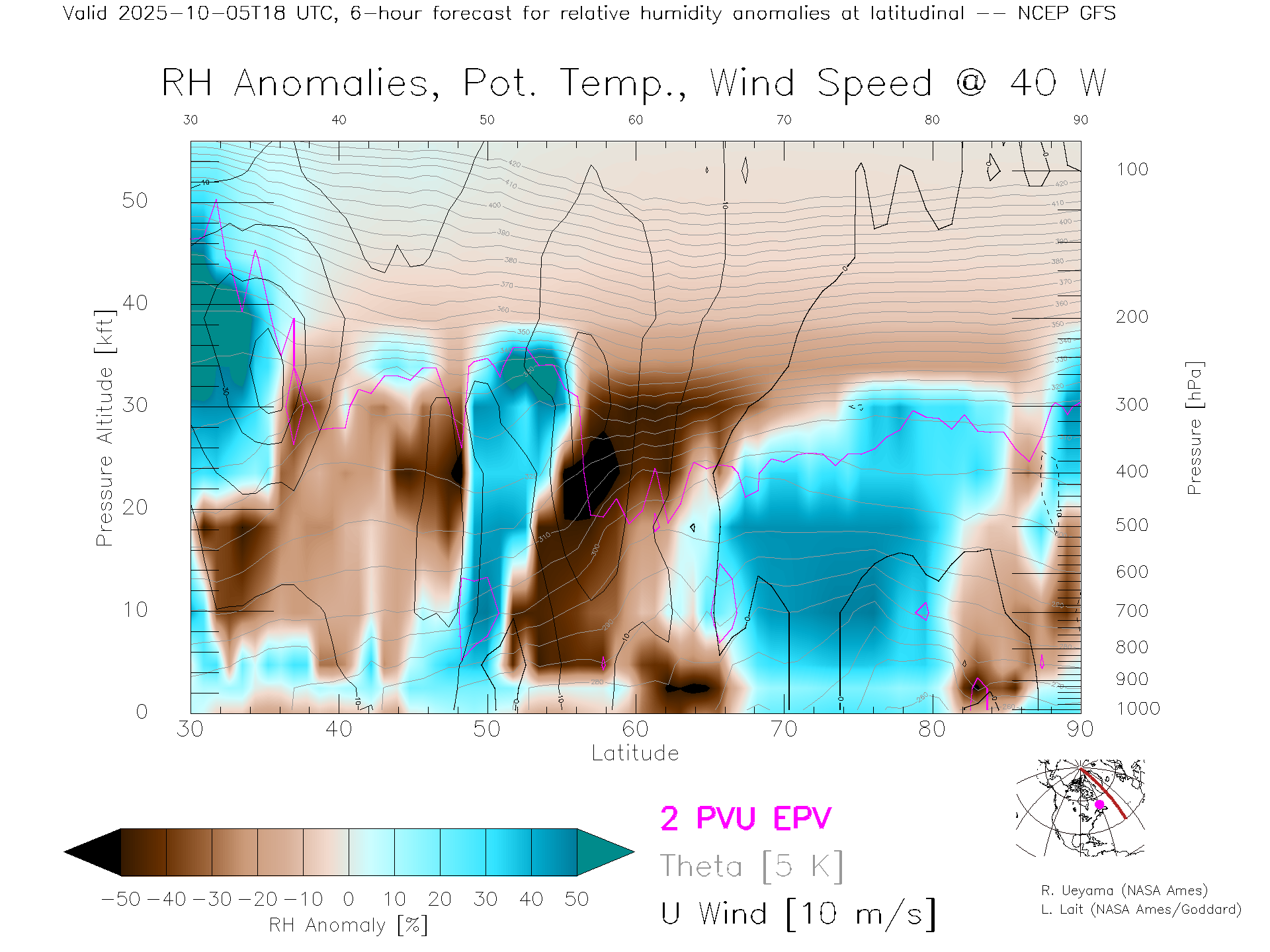 NCEP GFS Forecast Rel. Hum. X-Section (40 W)