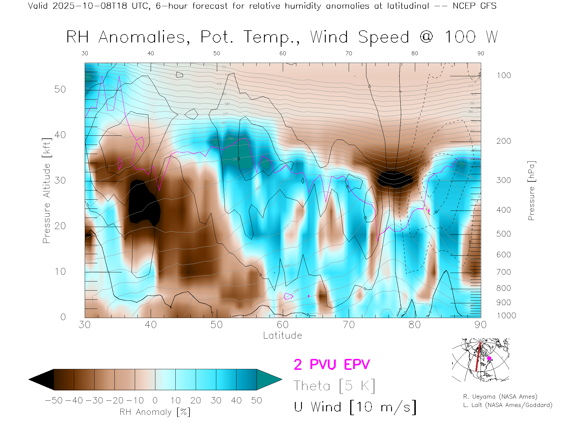 NCEP GFS Forecast Rel. Hum. X-Section (100 W)
