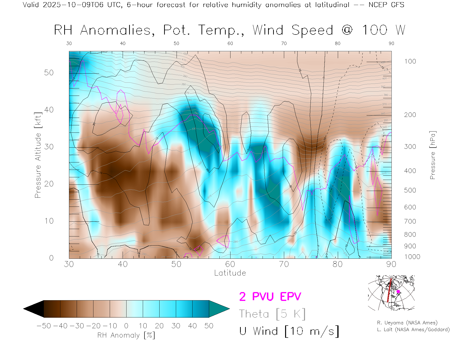 NCEP GFS Forecast Rel. Hum. X-Section (100 W)