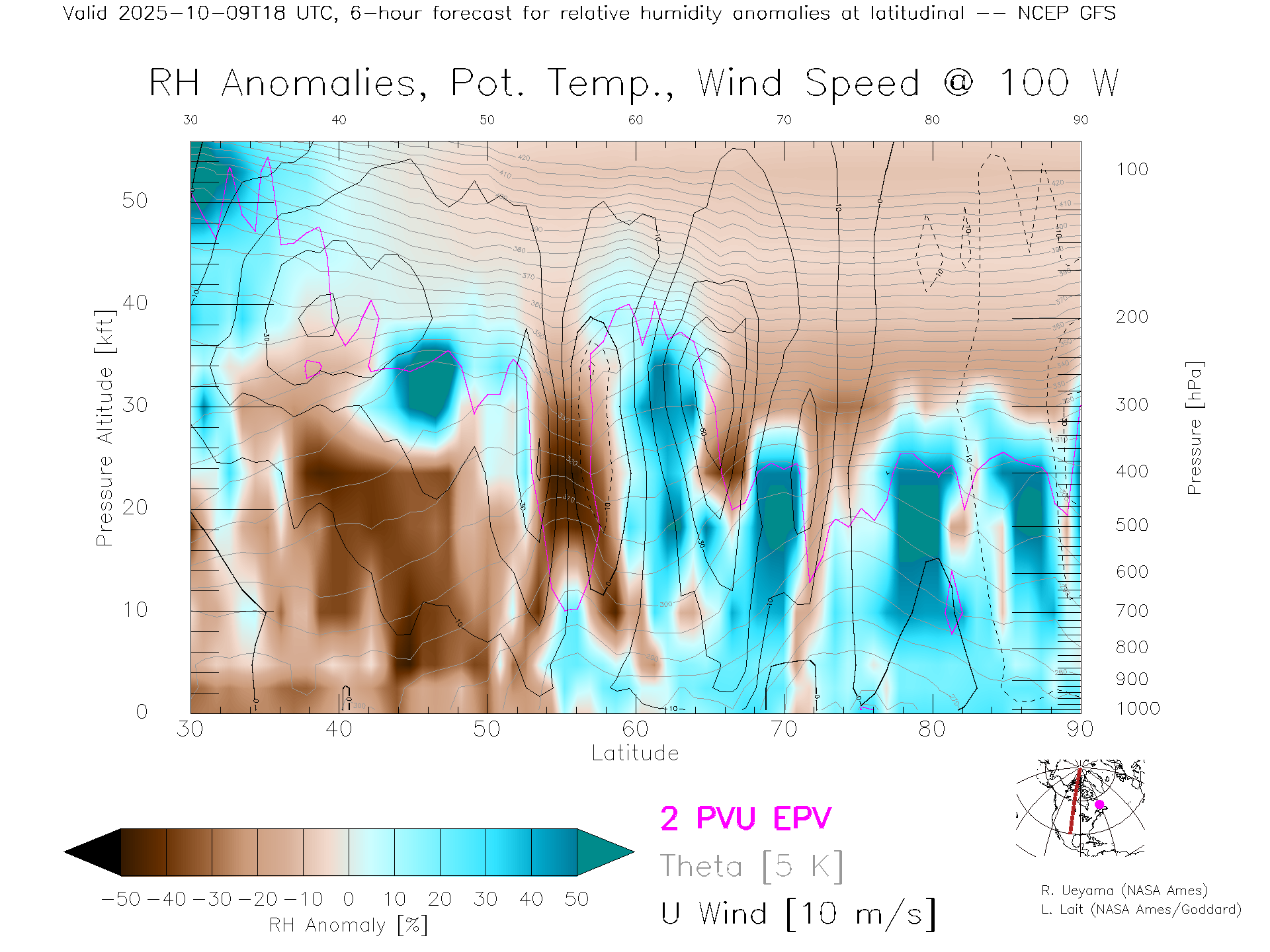 NCEP GFS Forecast Rel. Hum. X-Section (100 W)